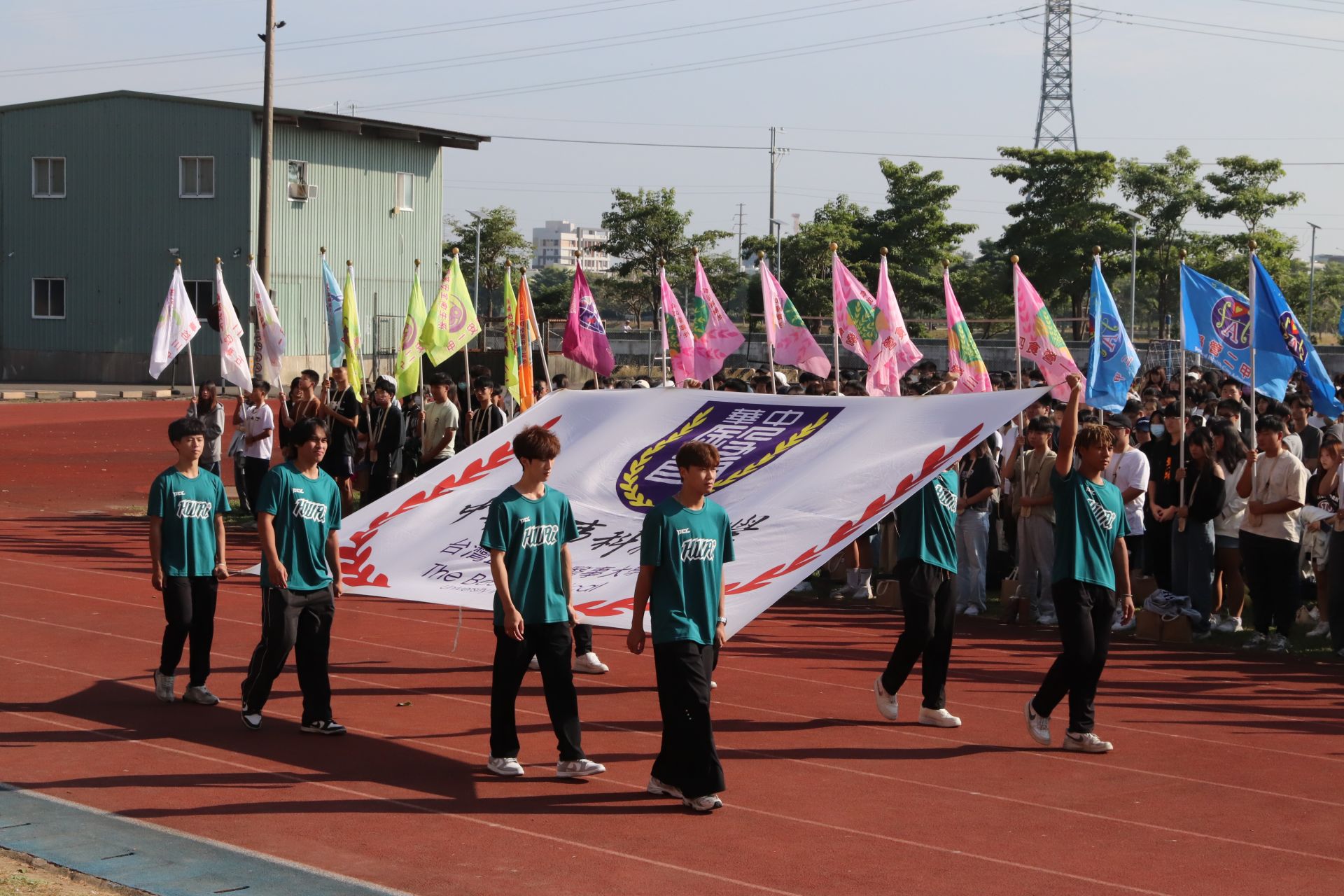 ▲中華醫大57週年校慶運動會開幕,排球校隊選手護送校旗進場。(圖/中華醫大提供)