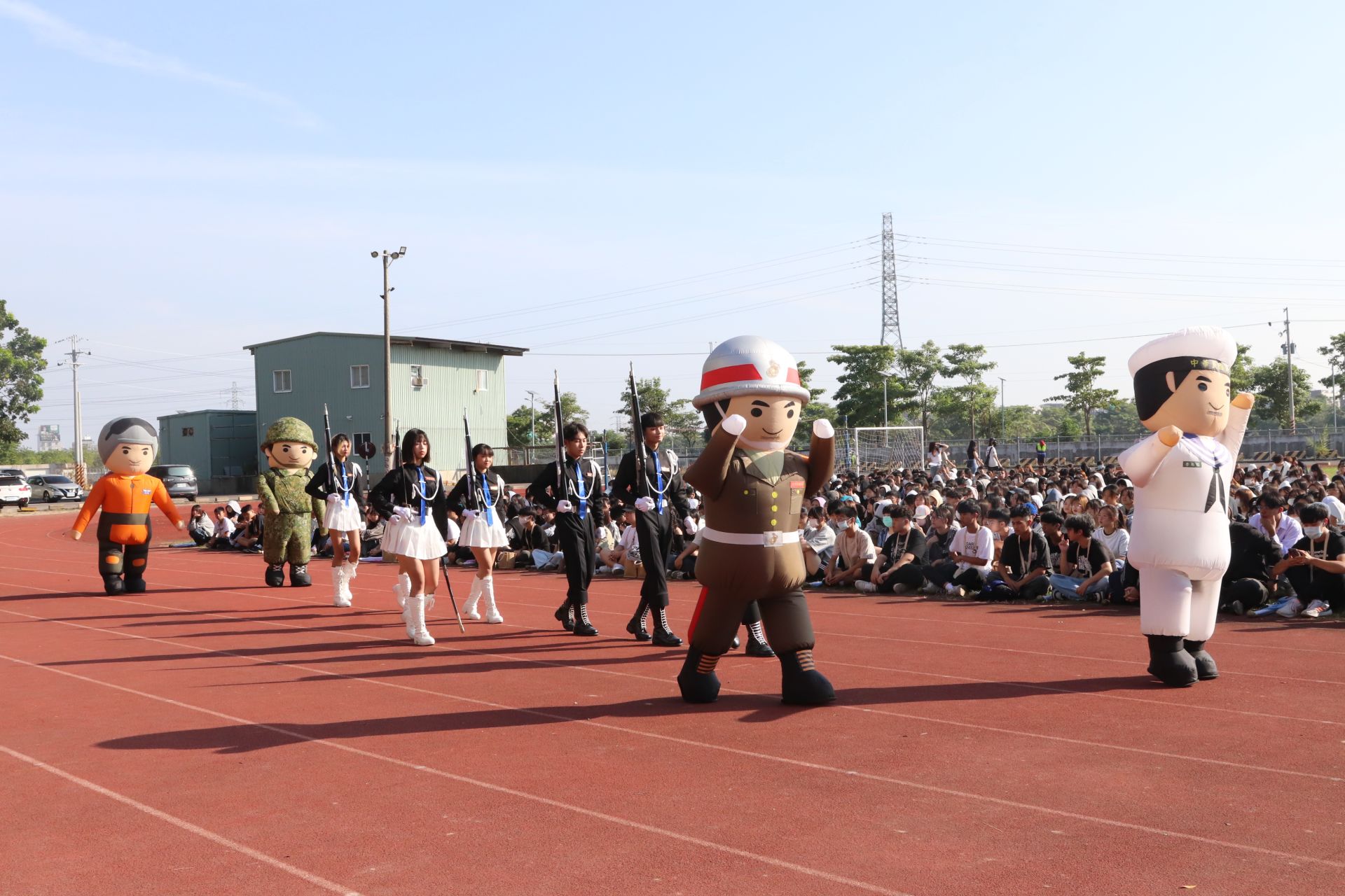 ▲國軍砲兵訓練指揮部及南部國軍人才招募中心結合學生社團為中華醫大校慶運動會帶來儀隊和大頭娃娃兵表演。(圖/中華醫大提供)
