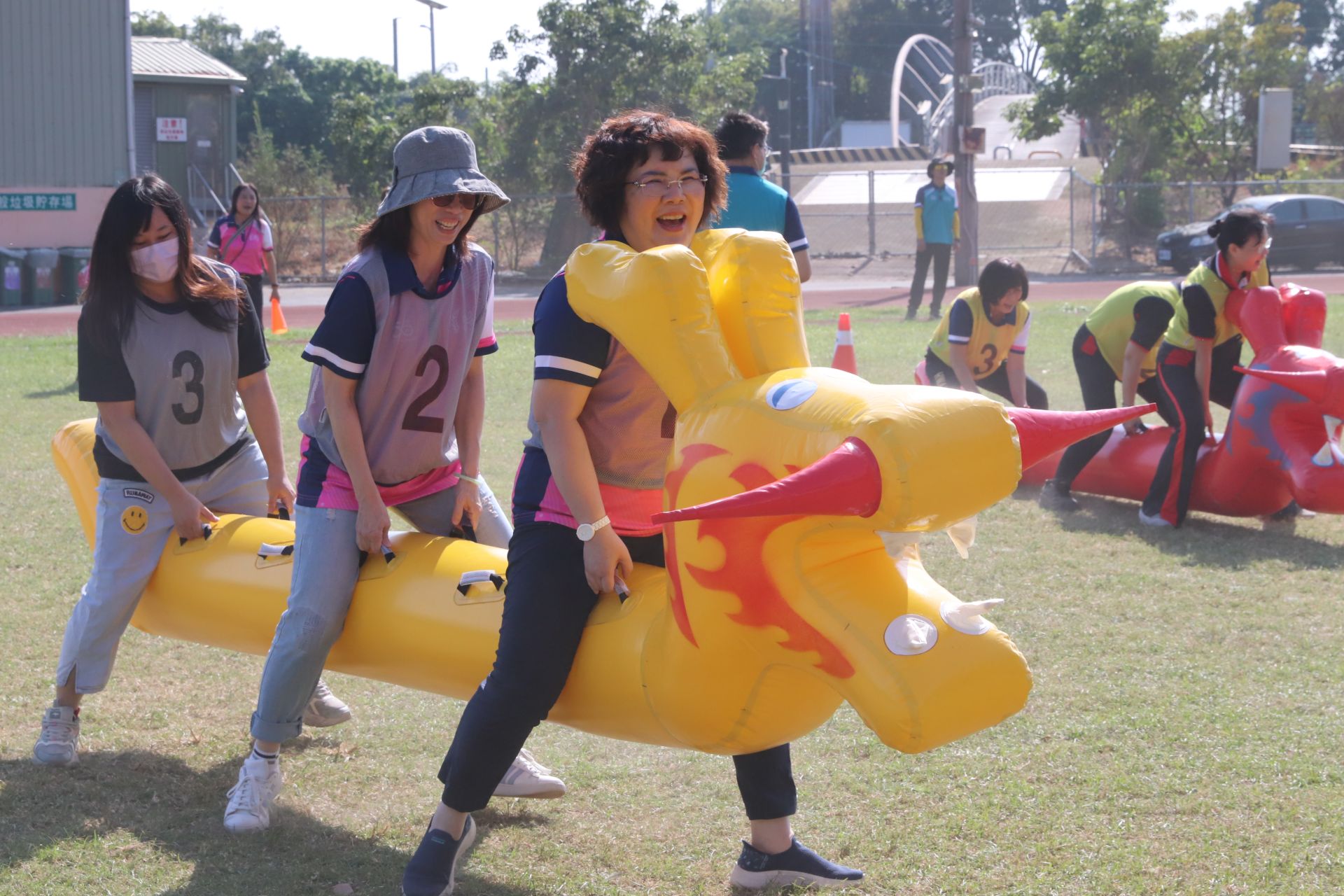 ▲中華醫大校慶運動會教職員趣味競賽,李碧娥校長(前) 帶領行政組參賽。(圖/中華醫大提供)