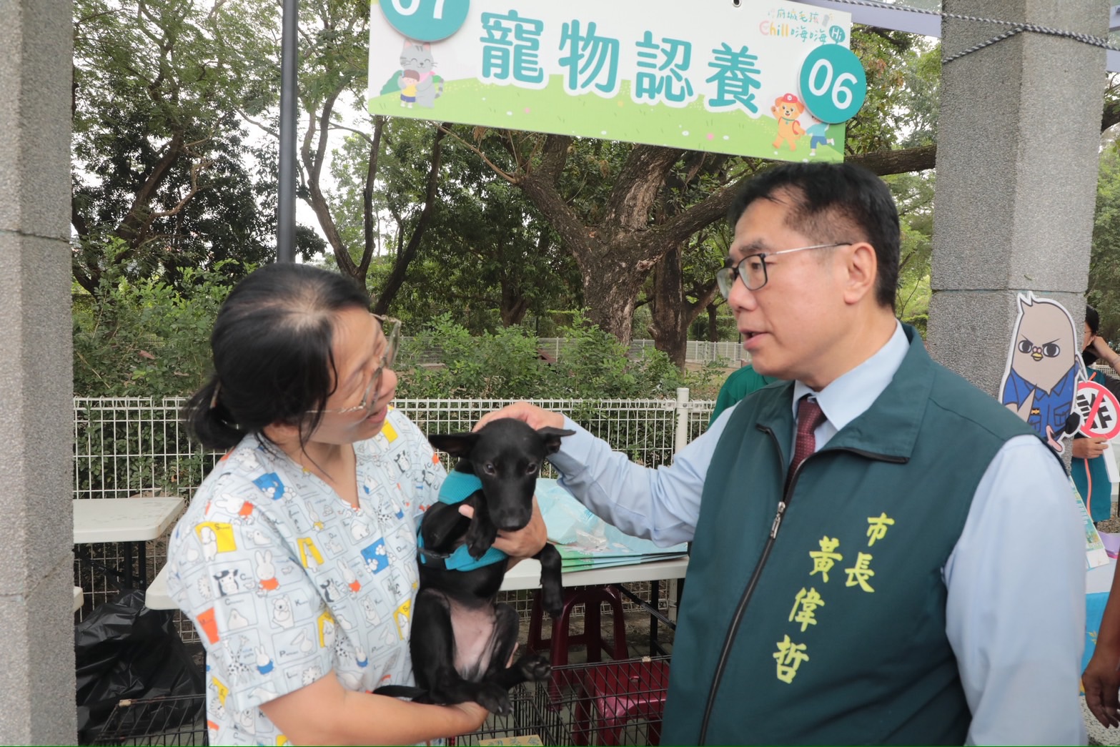 ▲市長黃偉哲於活動現場親切與民眾互動,關心寵物認養攤位的毛孩情況,鼓勵以領養代替購買,推廣負責任的飼主觀念。(新聞處 提供)
