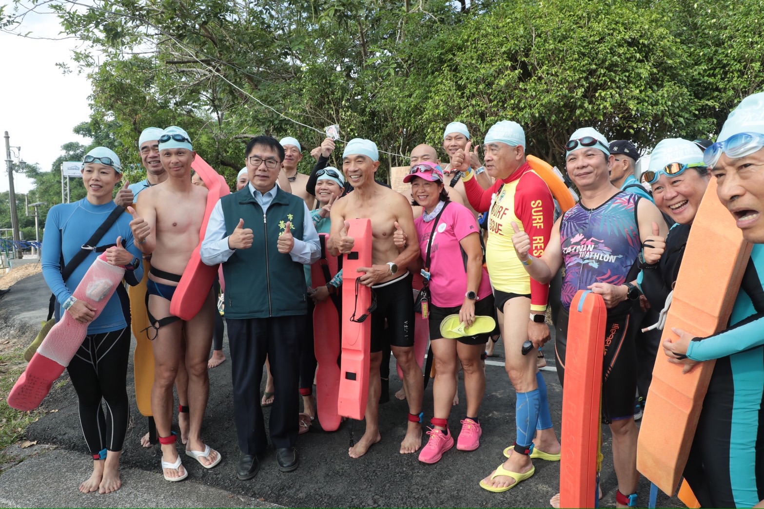 ▲市長黃偉哲與泳者合影留念,肯定大家挑戰自我、勇敢下水的運動精神。(記者黃雋淮 翻攝)
