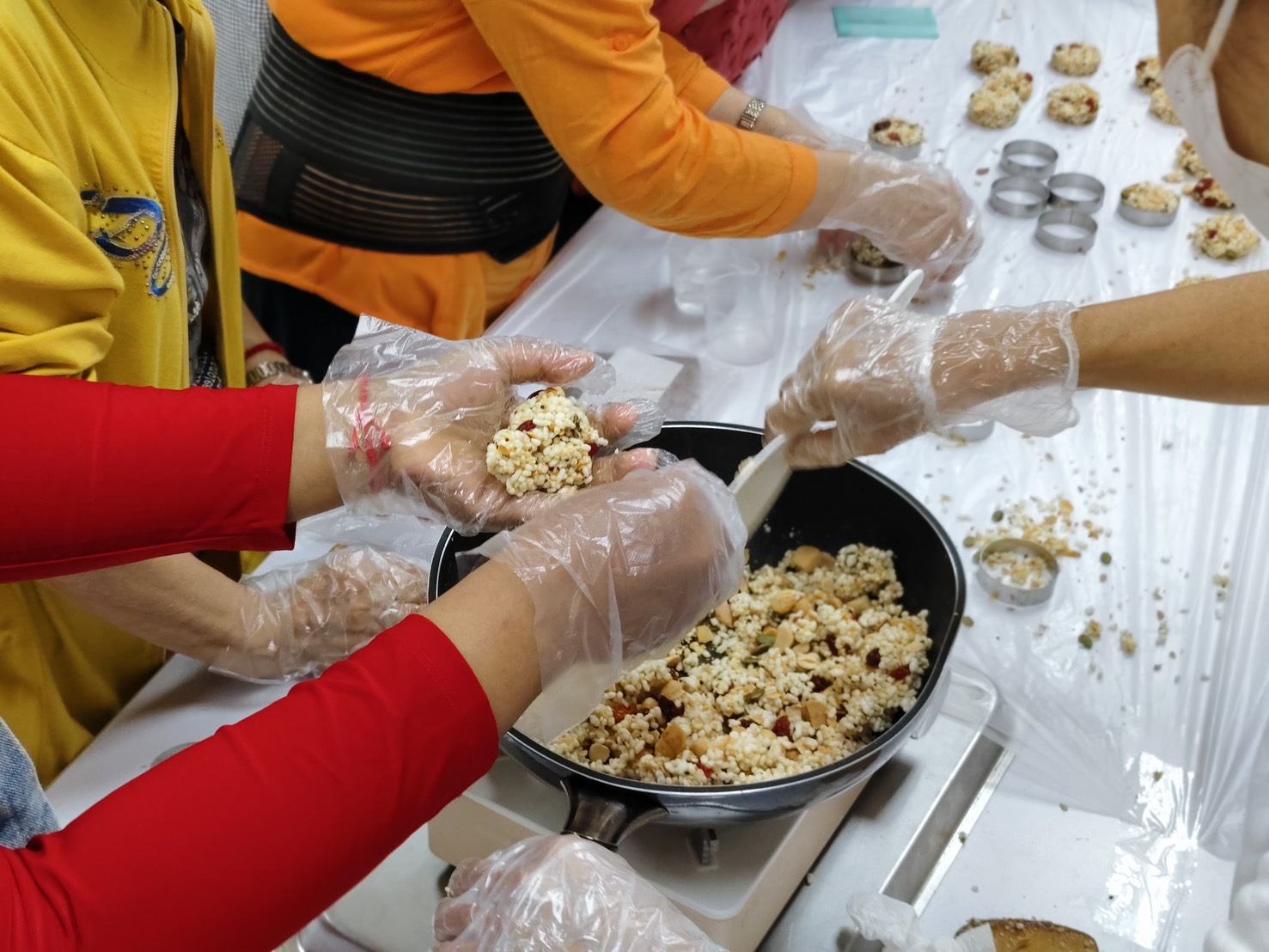 此次課程由樂活基金會蔡社工,攜手社區志工美華與素美共同帶領,選用天然、低糖的在地食材,指導長輩製作兼具創意與健康概念的「幸福米香餅」。從材料介紹、步驟示範到實際操作,長輩們興致高昂、紛紛戴上手套躍躍欲試。隨著攪拌、壓模、脫模、包裝的過程展開,從最初的手忙腳亂,到後來各自認領崗位、分工合作,大家攜手完成一份份香氣四溢的「幸福米香餅」,據點內笑聲不斷、氣氛溫馨熱鬧。