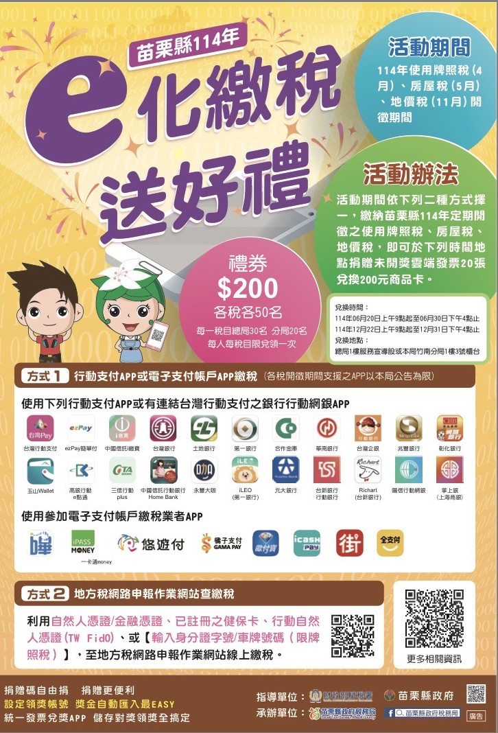 為鼓勵民眾多使用e化方式繳納稅款,苗栗縣稅務局特別舉辦「e化繳稅送好禮」活動。凡使用行動支付、電子支付帳戶或利用地方稅網路申報網站,如期繳納苗栗縣114年開徵的地價稅者,即可於指定期間參加送好禮活動,活動獎品200元禮券計50名(總局30名、分局20名)!
