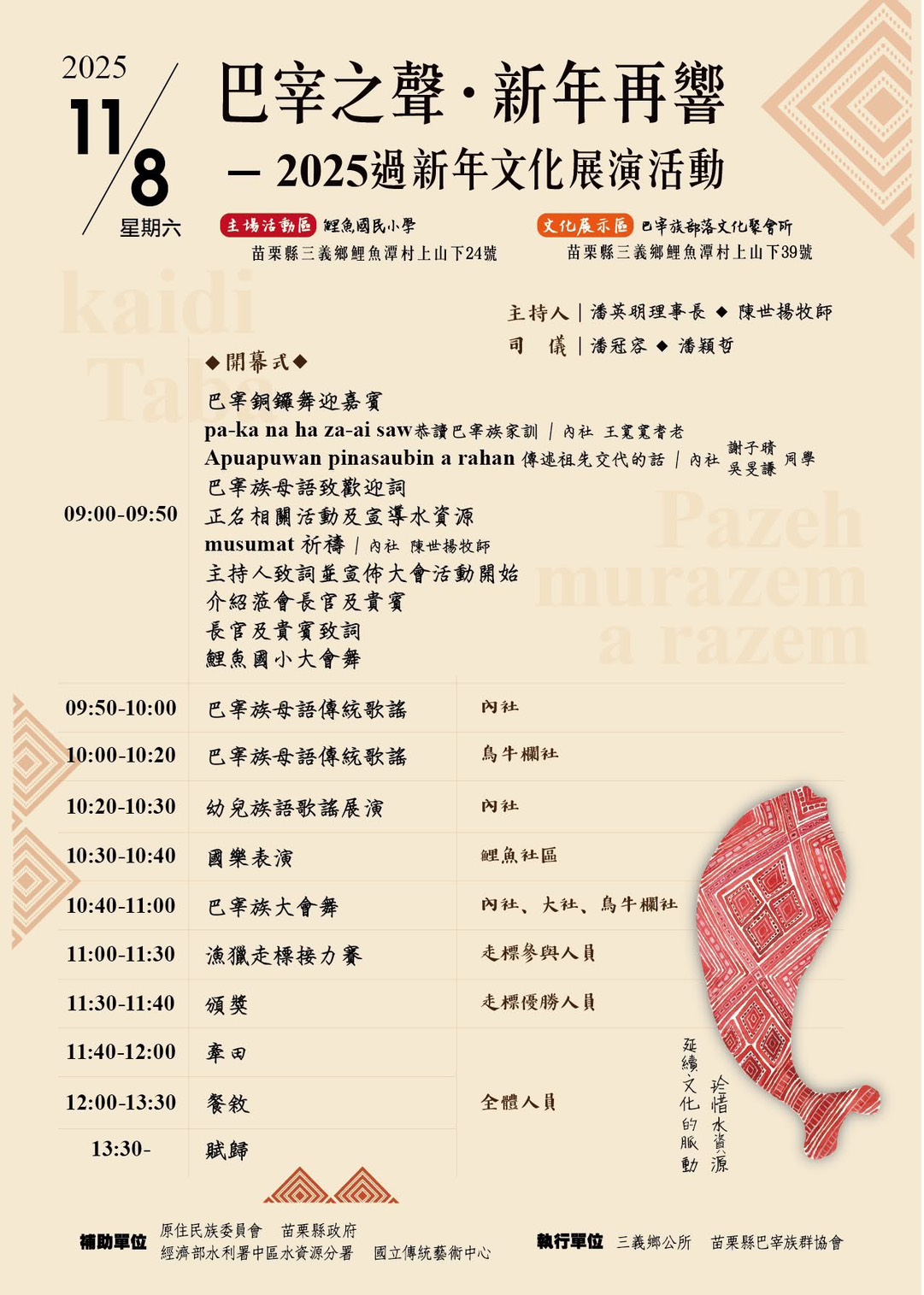 睽違6年!苗栗縣巴宰族11月8日重啟的「過新年」儀式,於三義鯉魚國民小學舉辦「巴宰之聲.新年再響」文化展演,苗栗縣巴宰族群協會表示,「巴宰之聲.新年再響」象徵族人重新凝聚與文化再生的契機,亦反映疫情與長輩辭世後族群文化的延續意志。
