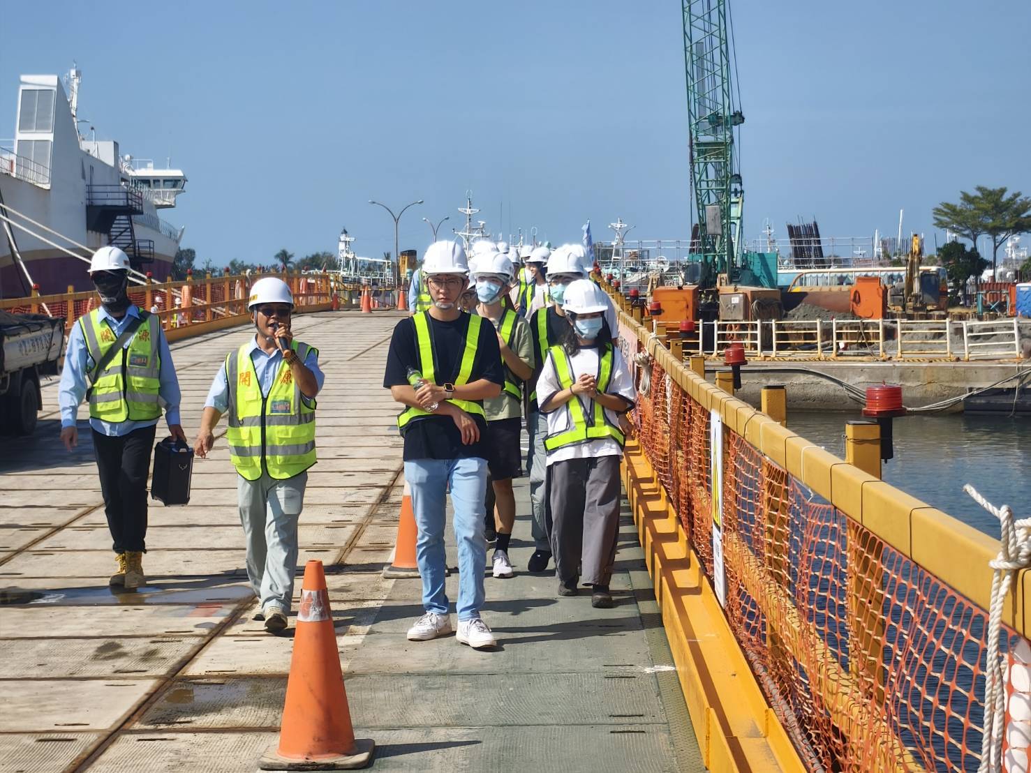 成功大學土木工程學系師生在今(6)日參訪「安平漁港跨港大橋新建工程」,工務局指出,跨港大橋工程設計以安全、美學與環境共榮為核心,透過學校參訪,有助於相關系所了解公共工程設計理念,以及台南重大市政建設進度,並藉此介紹採購廉政平台的推動情形。希冀協助大專院校相關系所更深入了解實務面挑戰,並啟發未來投入公共建設的熱情。