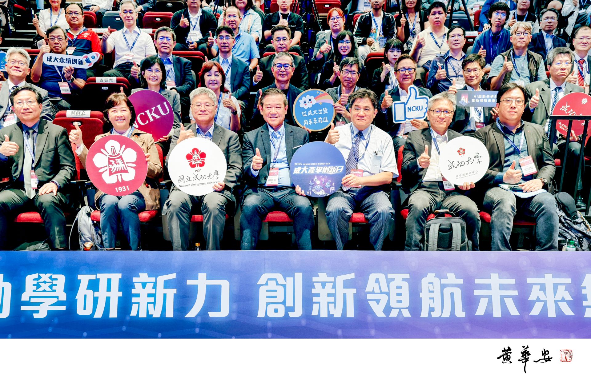 成大產學創新日吸引近九百名產官學研人士及校內師生參與,現場代表合影留念,展現跨域合作能量與推動南部科技發展的決心。(圖/記者黃華安攝)