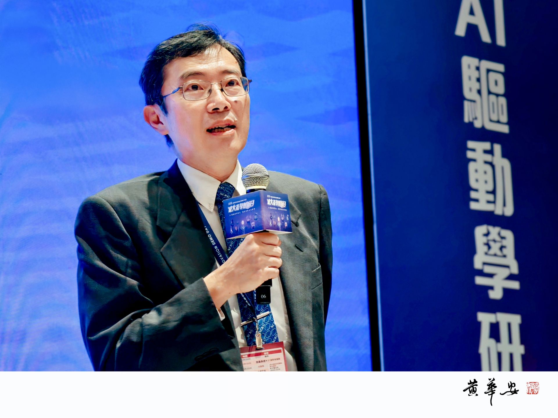 成功大學電資學院副院長連震杰於論壇介紹成大在算力建置、聯邦學習以及機器人與運動科技應用上的研究成果。(圖/記者黃華安攝影)