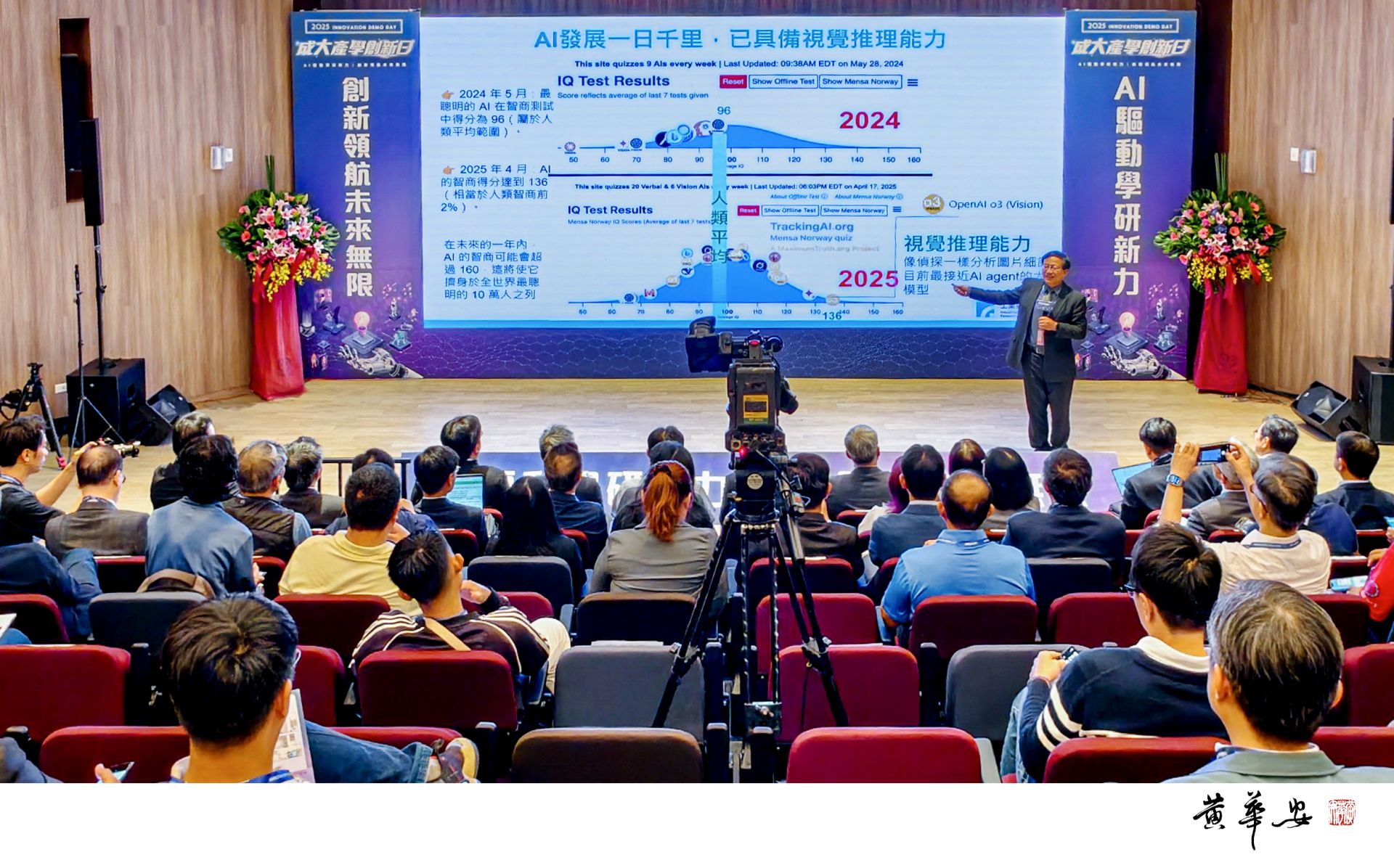 工研院協理蘇孟宗於 AI 論壇分享大型語言模型發展趨勢,說明 AI 推理能力快速提升,吸引與會者關注。(圖/記者黃華安攝)