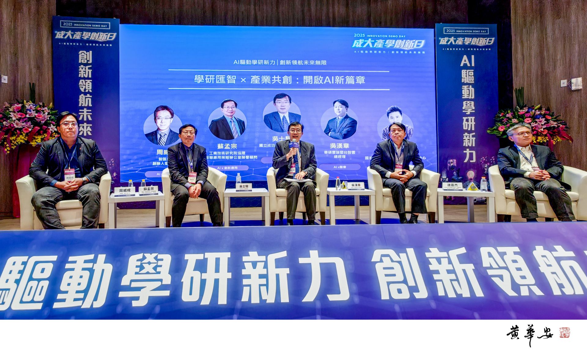 AI 論壇由成功大學電資學院院長吳士駿主持,蘇孟宗協理(左三)、吳漢章總經理(左四)、連震杰副院長(左五)、周威成執行長(左一)等講者分享從工研院、科技產業、學研機構與新創視角,提出 AI 落地實務、制度治理與人才培育等觀點。(圖/記者黃華安攝)