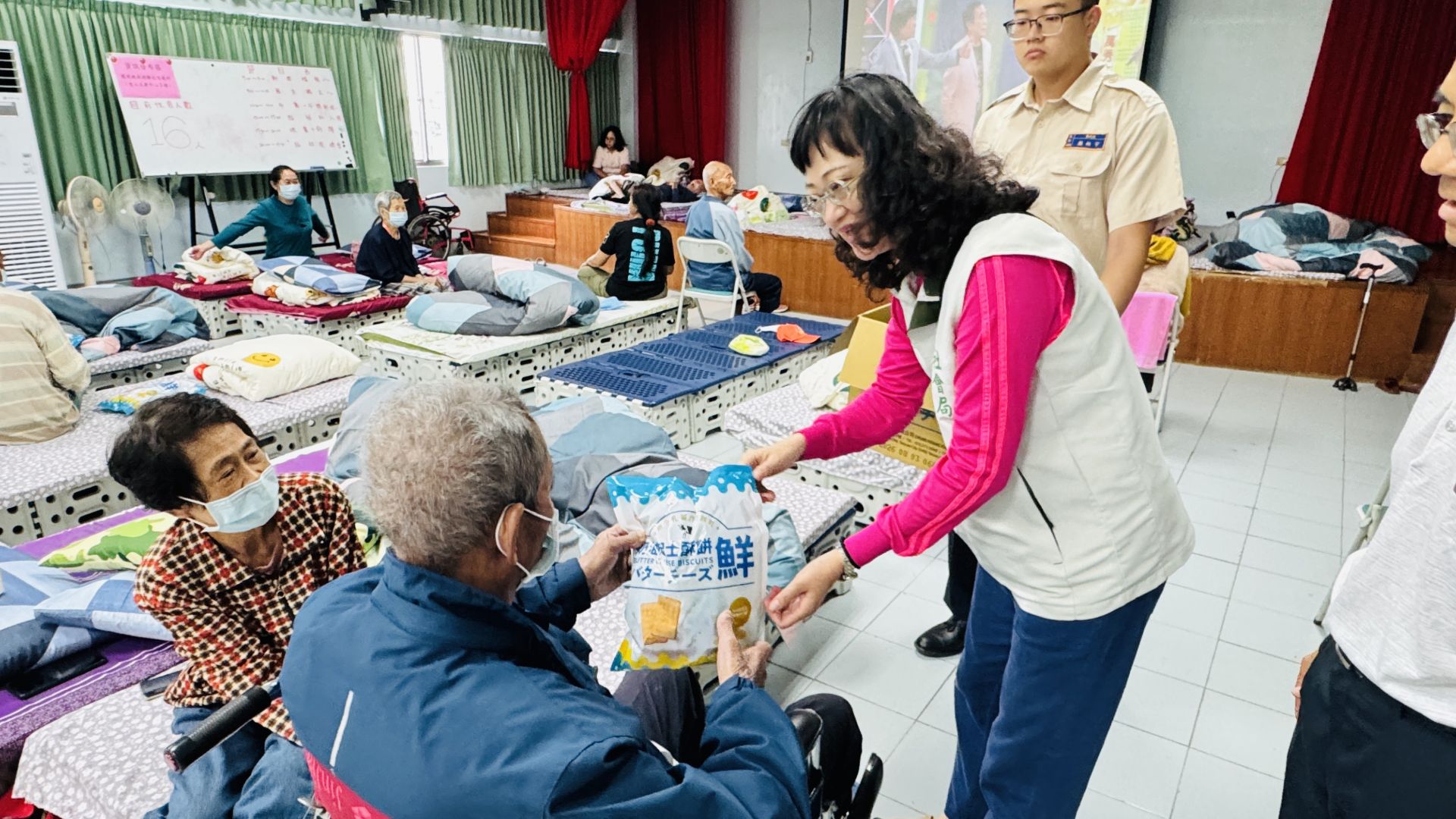 今(12)日社會局主任秘書陳雅芬前往鹽水區老人文康活動中心,關懷預防性收容中心內提前入住的16位民眾,了解生活狀況與心理感受,並致贈民生物資,傳達市府的溫暖與關懷。入住民眾林奶奶表示,雖然風雨還沒到,但提前來這裡真的比較安心,志工也都很照顧我們。」另一位王先生也說,感覺政府有準備,心裡比較不慌。