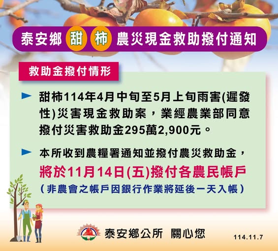 泰安鄉公所公告,針對甜柿作物於114年4月中旬至5月上旬因雨害(遲發性)受損之現金救助案,業經農業部核准同意撥付災害救助金總計295萬2,900元。