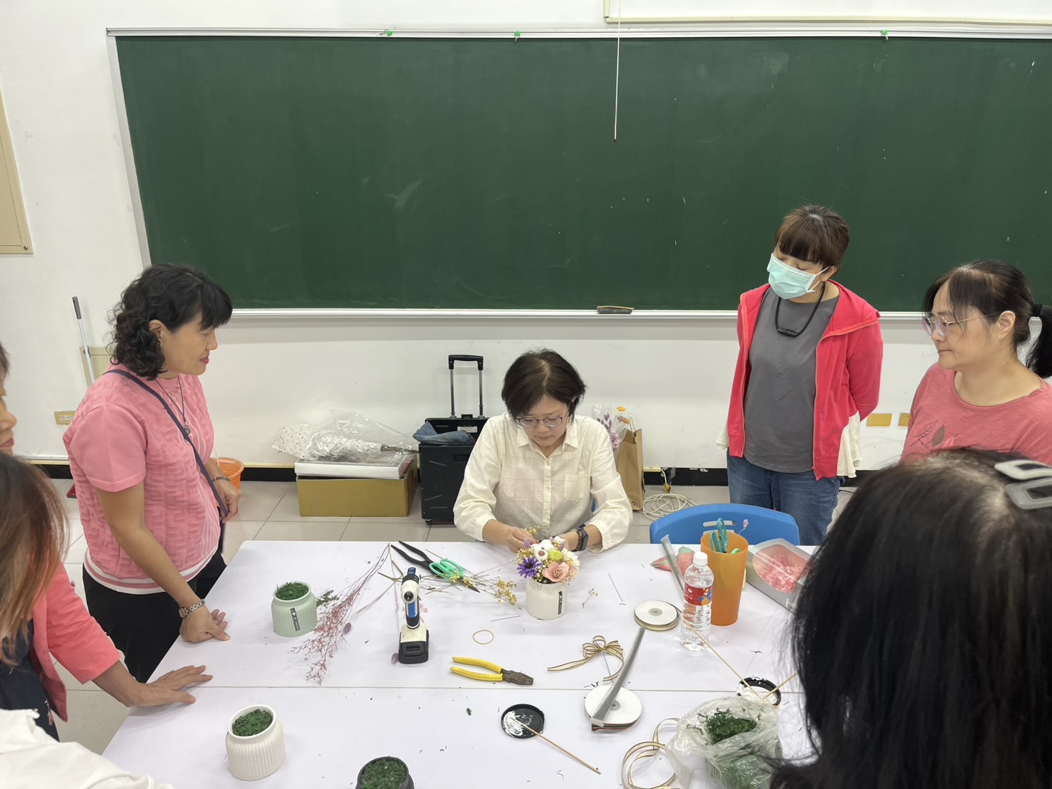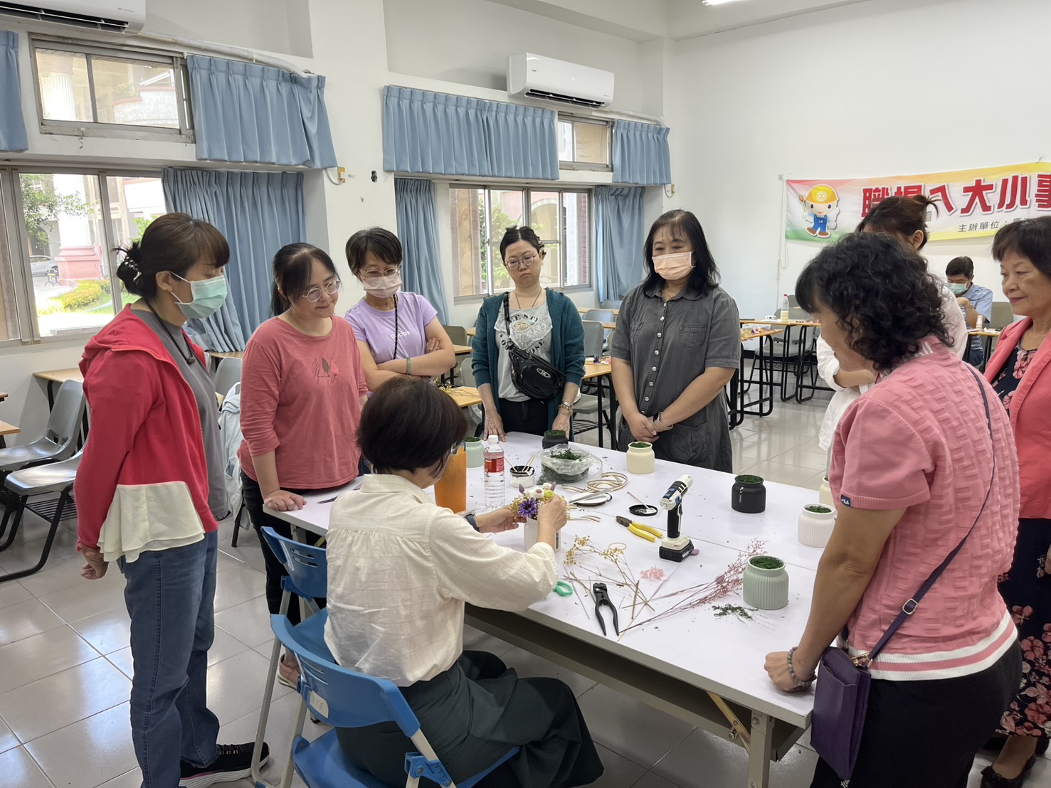 今日課程內容蔡玉娟老師以淺顯易懂的方式,介紹植物基本知識與花藝美學的核心概念。讓學員們能運用簡單素材,親手創作出獨具風格的花藝作品,並將成品帶回家與親友分享,不僅增添生活情趣,也提升藝術涵養與審美品味。
