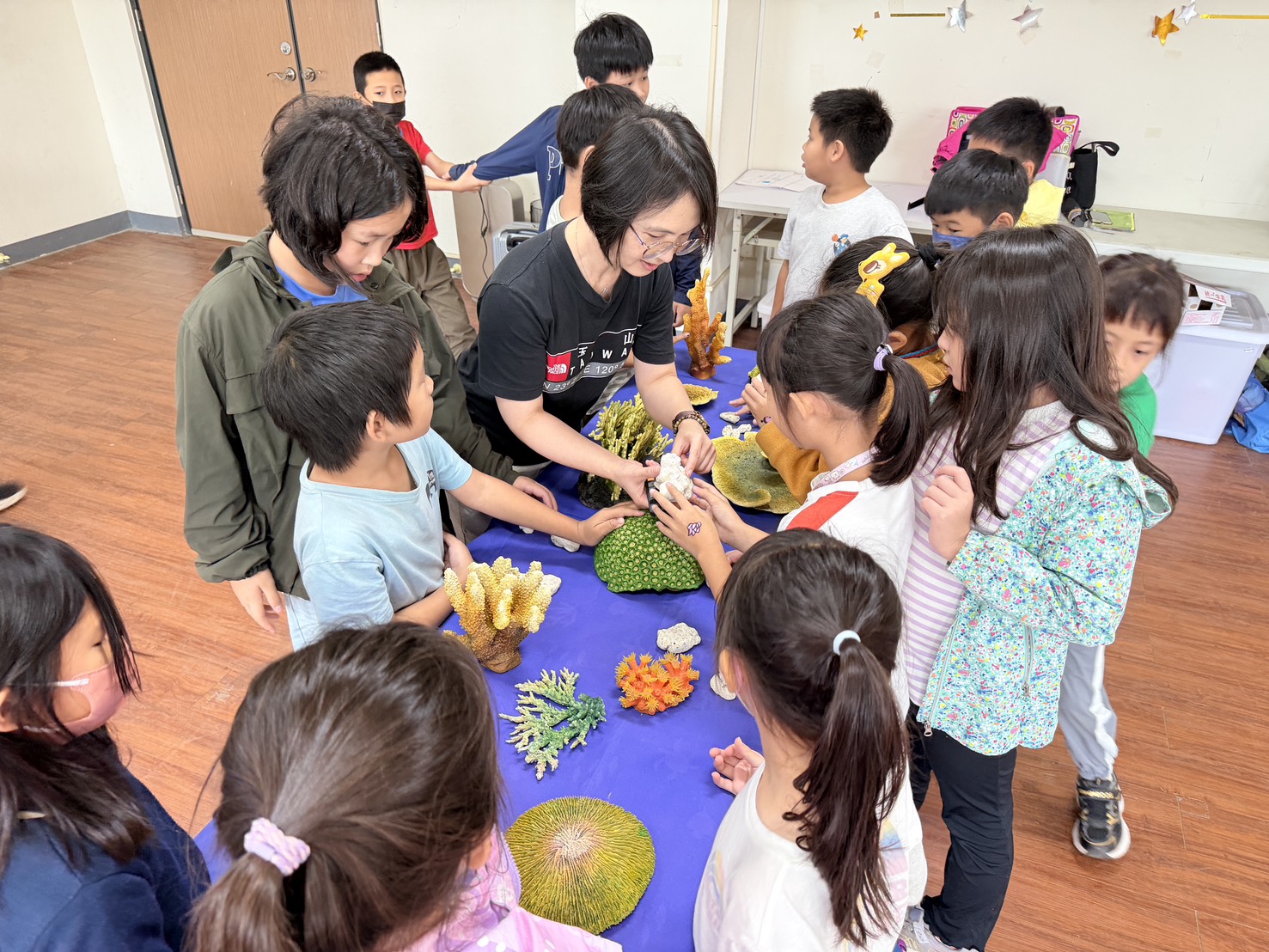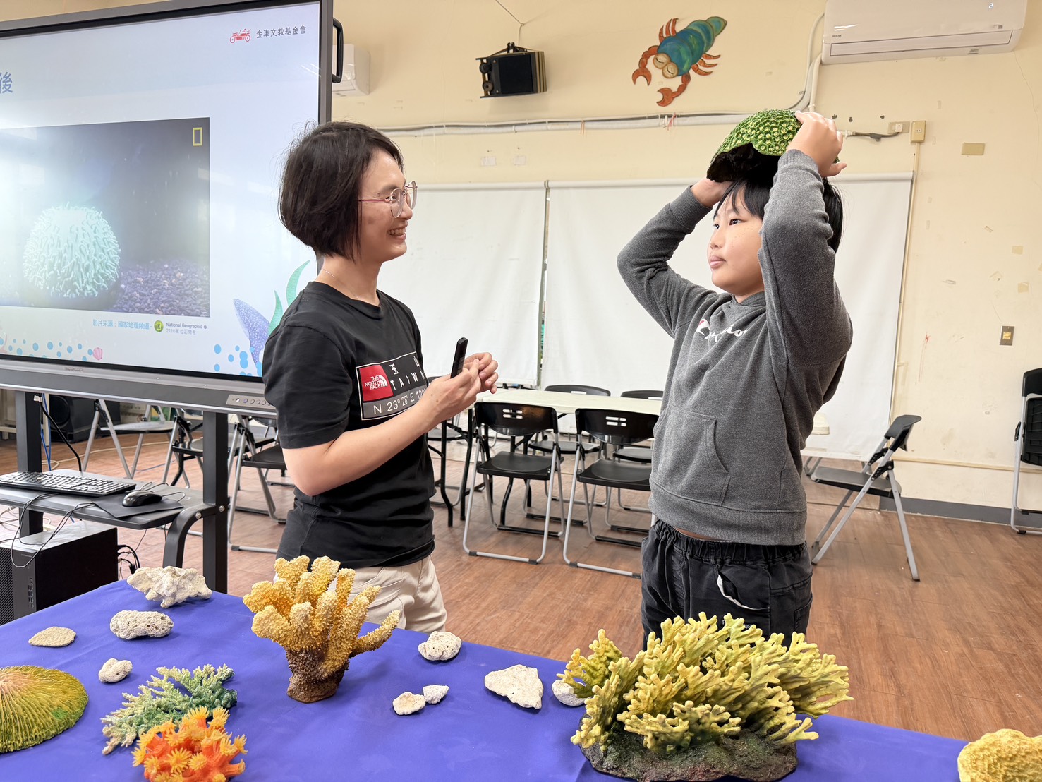 其中,11月18日於七股區光復生態實驗小學舉辦的講座更是亮點十足。講座以「珊瑚保育與氣候變遷」為核心,從珊瑚的生物特性談起,引導學生認識其作為海洋「育嬰房」的重要性。並與國立海洋生物博物館合作,帶來十款擬真珊瑚模型,讓學生近距離觀察不同形態的珊瑚,包括團塊狀、表覆型與葉片型等,顛覆過往僅以鹿角狀為主的既定印象,也透過近距離觀察與觸摸,提供學生豐富且具啟發性的感官學習經驗,學童也更能感受七股濕地與海洋環境緊密相連的生命鏈結。課堂中,學童踴躍提問、積極參與,展現對海洋議題的高度興趣。