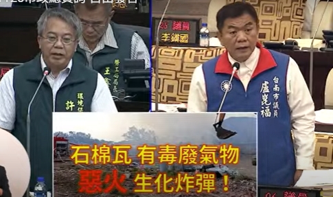市議員盧崑福說,露天焚化爐,看現場,綜合垃圾和颱風過後的廢棄物,今天火燒山的煙非常毒,空污問題嚴重,石棉瓦有毒,若有石棉瓦就猶如生化炸彈,因為釋放出來就是有毒廢氣,環保局無力無能圖利,局長說會負責,就讓其停職,這幾天外界傳的風風雨雨,也要求消防局,儘速讓垃圾山完全熄火。