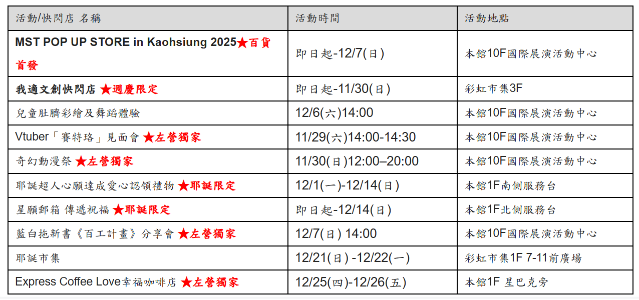 隨著耶誕氣氛到來,推薦耶誕禮物心願清單,化妝品推出美妝耶誕禮盒、驚喜倒數月曆,今年冬天必買SABON 流光夜宴限量系列24天倒數月曆2025 (特價8,880)、KIEHL's 經典派對倒數月曆(特價3,980),結合週慶壓軸優惠至11/30會員獨享「滿仟送仟點」全館指定專櫃skm pay累計刷3,000送2,000點skm points/限量!除此之外,集結多元冬季話題活動,打造最具儀式感的冬季耶誕節,包含超高人氣 Vtuber 見面會、人氣作家藍白拖心書分享會、療癒系暖心耶誕市集,更攜手家扶基金會北高雄中心,邀請小朋友在耶誕樹上寫下心願,號召民眾主動認領,用滿滿愛心為孩童圓夢。