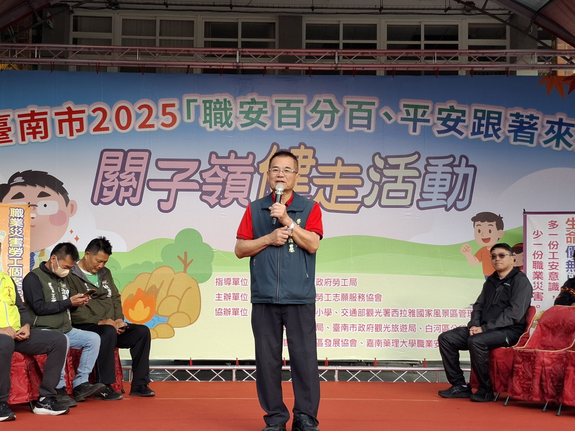 為呼應市長偉哲力推健康永續「希望家園」,勞工局於今(30)日星期日在白河區關子嶺仙草實驗小學關嶺分校舉辦2025「職安百分百、平安跟著來」關子嶺健走活動,上千名勞工朋友熱情響應,勞工局長王鑫基與現場熱情民眾作伙走出健康。健走活動健康又紓壓,許多勞工朋友全家大小攜手同遊關子嶺,千人參與場面盛大。蔡育輝議員服務處秘書王星翰、陳亭妃立委服務處暨後壁里里長陳志成、林俊憲立委服務處特助劉朝仁、林俊憲立委暨沈家鳳議員聯合服務處副執行長王偉晉、台南市總工會副理事長胡尚禮、大台南總工會副理事長陳美靜、台南市產業總工會秘書長黃育德、社團法人台南市勞工志願服務協會理事長梁志男、職業安全衛生署南區職業安全衛生中心主任許峯源、嘉南藥理科技大學職業安全衛生系主任賴振立等貴賓也到場同樂。