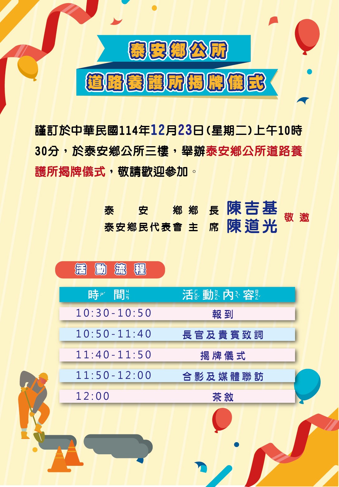 泰安鄉公所宣布「道路養護所」正式成立,將於12月23日舉行揭牌儀式。鄉長陳吉基表示,道路養護所的成立,是解決多年來道路維修不及、反應速度受限問題的重要突破,盼帶給鄉民更即時、更安全的道路服務。