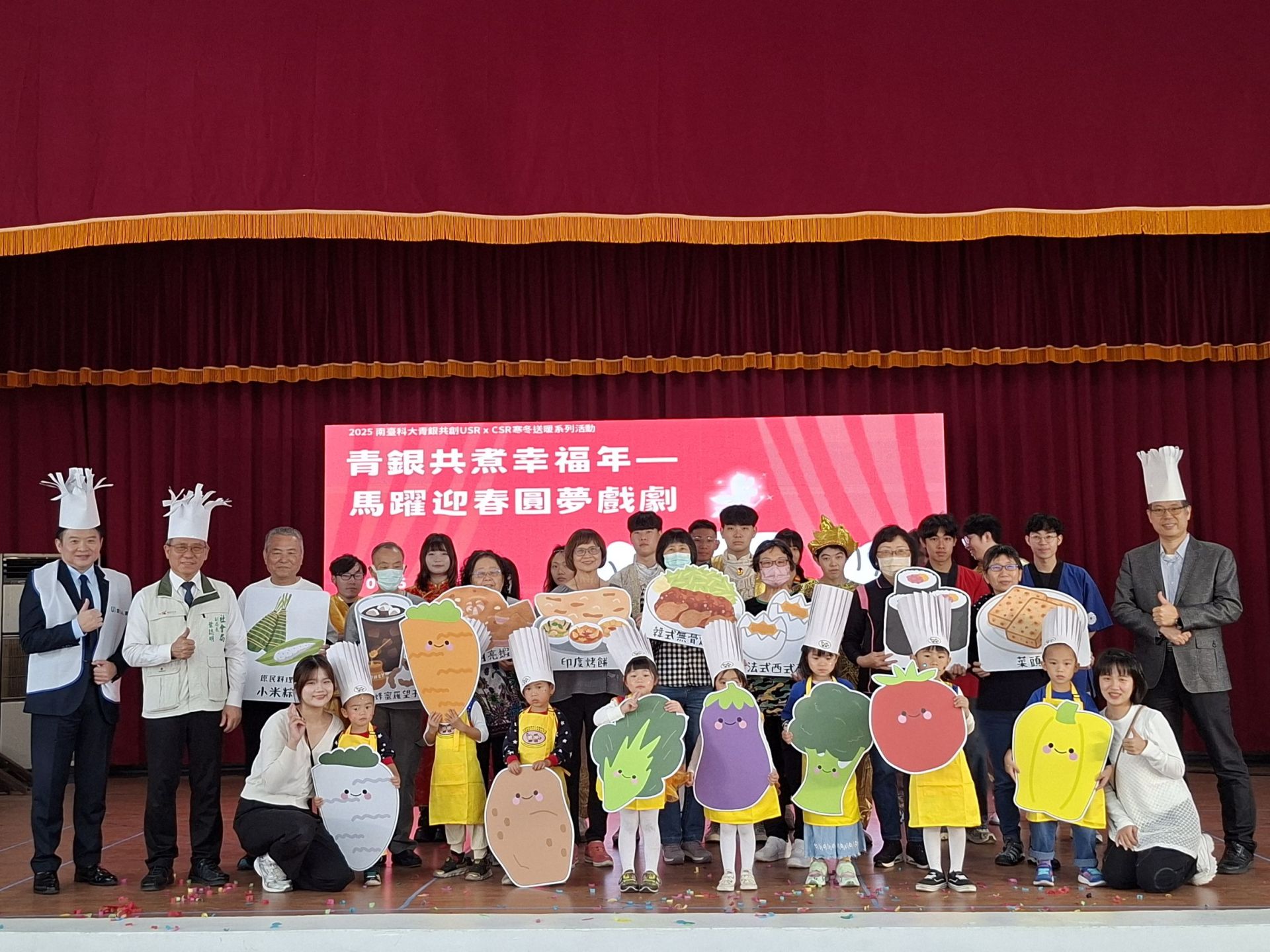 此次活動在南區金華社區充滿活力的老寶貝打擊樂團熱鬧揭開序幕,活動結合由老、中、青、幼跨世代「高齡圓夢戲劇」與「暖心送愛行動」,鼓勵長輩透過戲劇展演,分享自身生命故事與生活歷程,展現韌性與自我價值;同時融入「青銀共煮」活動,促進跨世代及跨族群互動與文化傳承,讓大學生、幼兒與長者在共煮、共演的過程中深化理解與情感交流。現場亦規劃書法體驗攤位與醫療諮詢區,讓居民共同參與、互動,展現社區長期推動健康促進與終身學習的成果。以實際行動傳遞愛與溫度。不方便前來活動的長輩,社會局老福科鄭妙君科長、南臺科技大學青銀共創USR計畫主持人陳美珠老師及鯤鯓里陳金江里長也特別到宅致贈暖心袋,讓長者在歲末時刻能感受到愛與關懷。