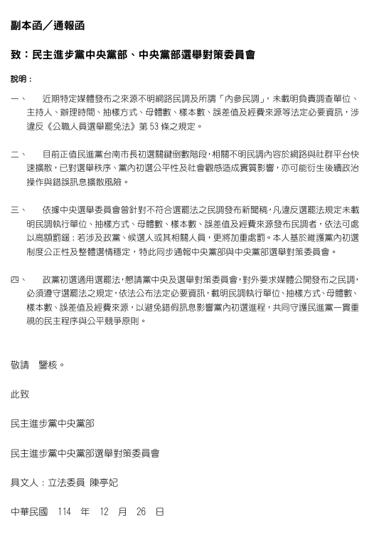 民進黨台南市長初選進入關鍵倒數階段,立委陳亭妃今正式發函通報民主進步黨中央黨部及中央黨部選舉對策委員會,針對近期特定媒體發布來源不明的網路民調及所謂「內參民調」,未依法揭露必要調查資訊,恐涉違反選罷法規定,呼籲黨中央比照中央選舉委員會標準,採取必要作為,維護初選制度的公正與公信。