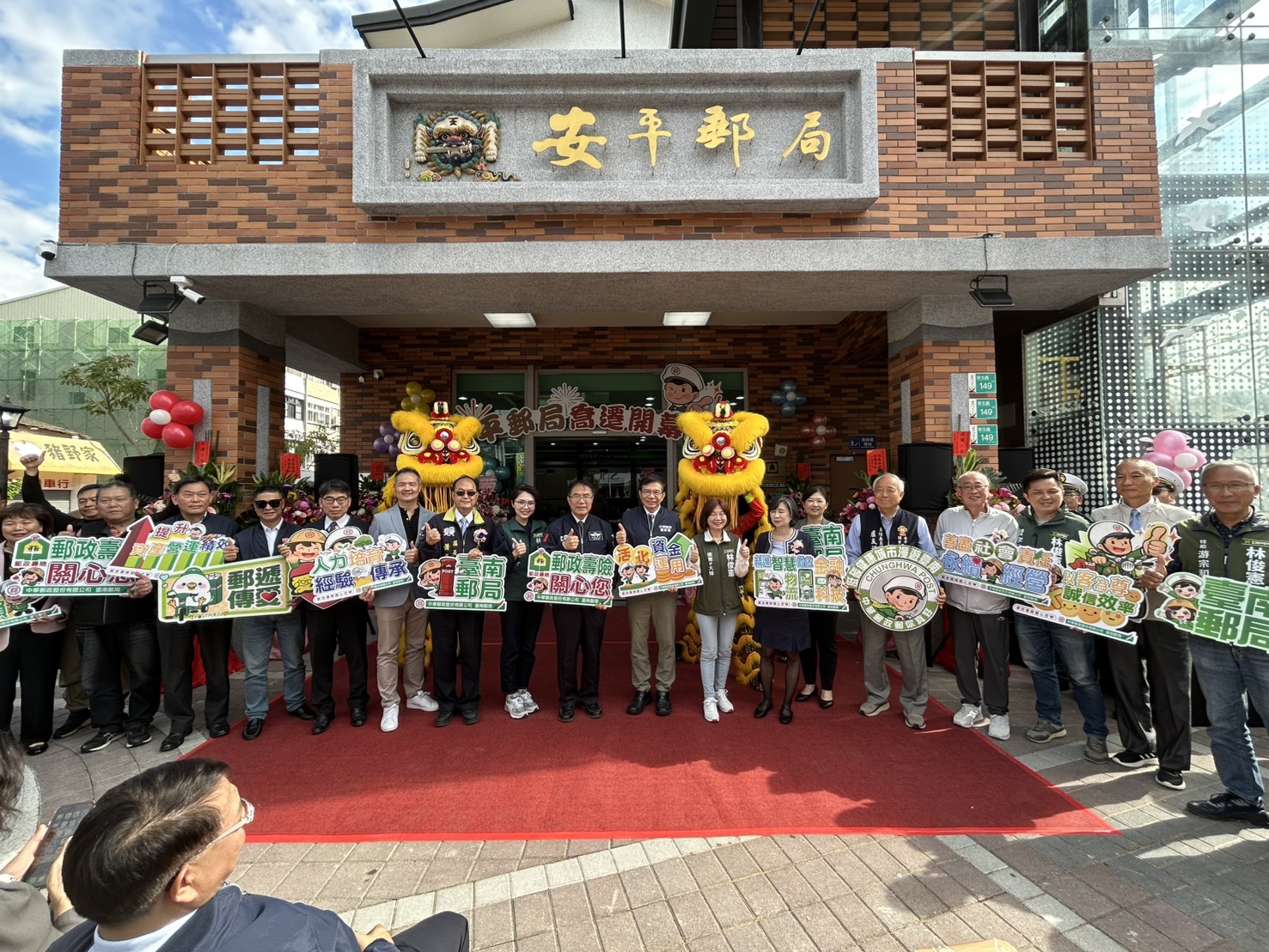 中華郵政公司指出,喬遷後的安平郵局新址位於安北路149號,與原址僅相距約100公尺,正對一級古蹟「安平古堡」,地理位置優越。為了呼應安平豐富的文化底蘊,此次重建特別打造極具特色的「劍獅郵筒」,內部空間設計更強調明亮舒適。此外,也特別規劃三樓為郵館,提供郵政在職及退休同仁旅遊休憩據點,活化空間運用。未來將持續秉持在地好鄰居的精神,為民眾提供親切貼心的服務。