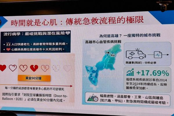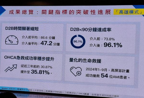 屏東基督教醫院副院長暨台灣心肌梗塞學會榮譽理事長黃偉春醫師表示高雄市在健保署支持下,推動「到院前救護車心電圖即時行動傳輸與線上判讀系統」,整合消防救護、醫療院所與醫師即時判讀機制,成功建立院前與院中無縫接軌之急性心肌梗塞救治流程。累計2024年至2025年11月,系統共上傳3,525例心電圖,其中5分鐘內完成判讀比例達90.4%,搶救212例急性心肌梗塞病人,線上醫師指導用藥達81人次,有效提前啟動院內急救與心導管治療準備,顯著縮短病人到院後治療等待時間。