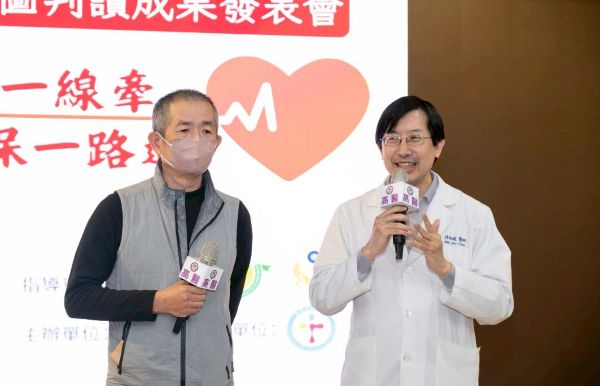 5.急性心肌梗塞個案王先生(左)蒞臨現場分享搶救歷程,高醫心臟內科許栢超主任(右)說明專業醫療介入與到院前心電圖判讀的重要性,呈現「高雄模式」院前院中無縫接軌的實際成效。
