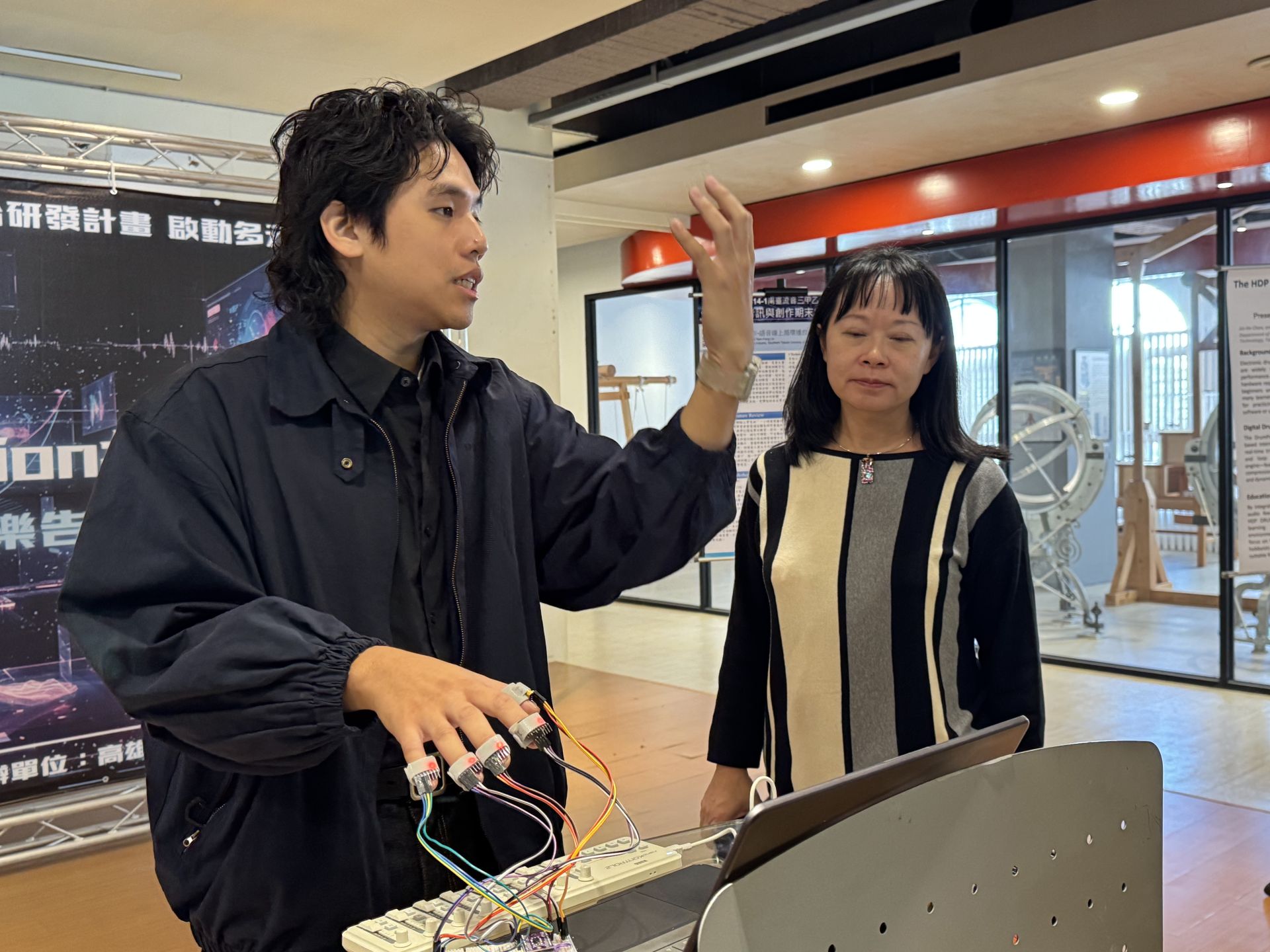 本次展演的最大亮點,是計畫主持人林岑芳老師與南臺科大流音系第一屆優秀校友、現任知名音樂多媒體製作人陳以諾共同研發的「手部感測跨域互動特效」。該系統採用消費級元件,卻能精準偵測極微小的指尖動作,讓即時感測化作舞台精彩而且細緻的互動呈現。