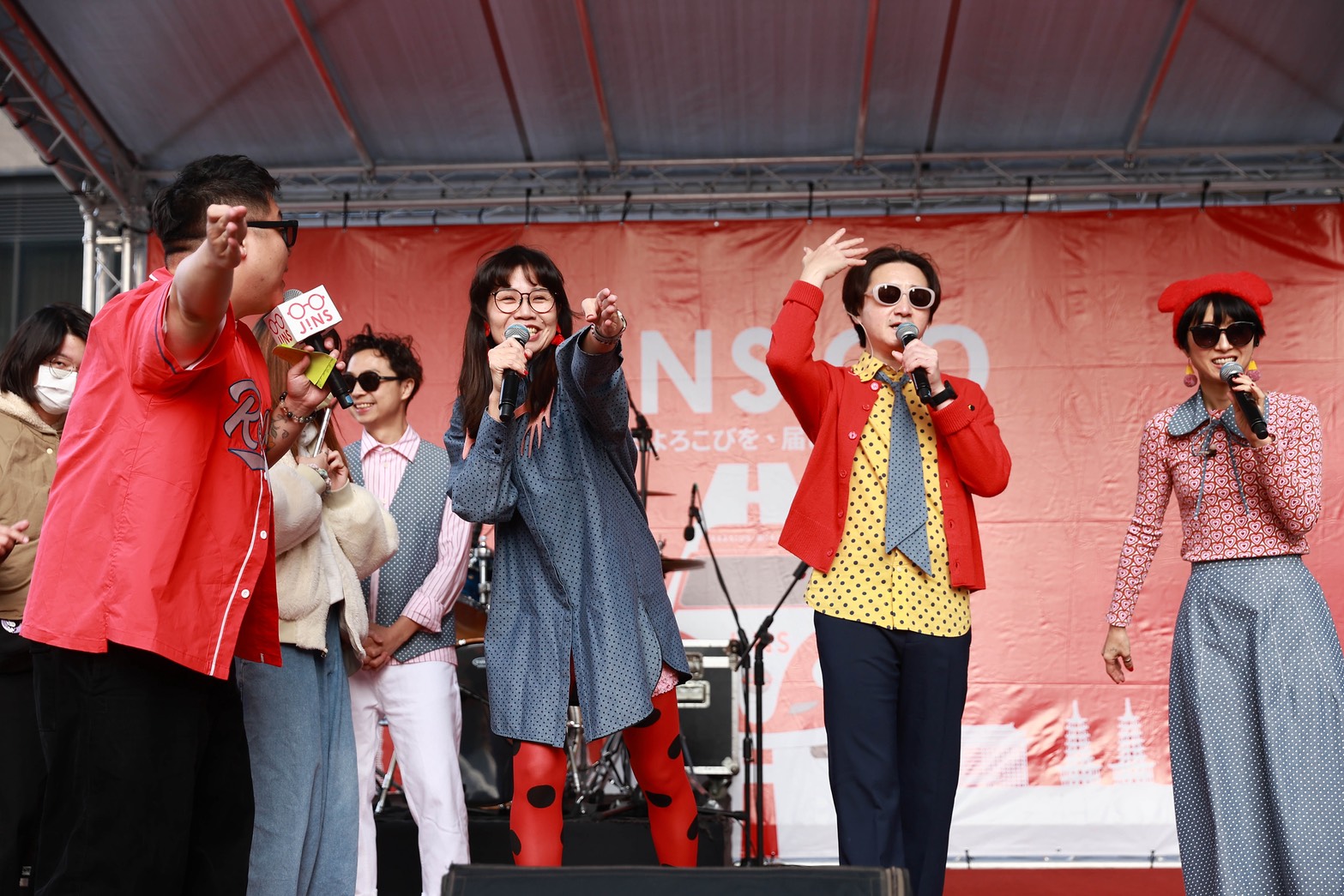 除了溫馨服務,JINS更力邀紅遍大港、浪人祭等音樂盛事的人氣樂團「芒果醬 Mango Jump」,於 1/10 (六) 在岡山樂購廣場火熱開唱。成軍滿八年的芒果醬以「音樂祭能量怪物」之姿,在岡山街頭展現極具渲染力的舞台節奏,帶來《我不想工作 aka 我會中樂透》、《長灘島》、《我喜歡你》多首耳熟能詳的神曲,並且加碼安可演唱經典歌曲《小紫aka給我錢》,芒果醬發揮即興創作長才,把「JINS」唱進歌裡,讓現場歌迷在嘶吼與感動中找到共鳴。儘管活動當天氣溫較低,仍有大批死忠樂迷提前一天到場卡位,芒果醬直白熱血的樂風宛如一劑勇氣藥引,與現場民眾一同在新年之初重新燃起面對生活的熱情。