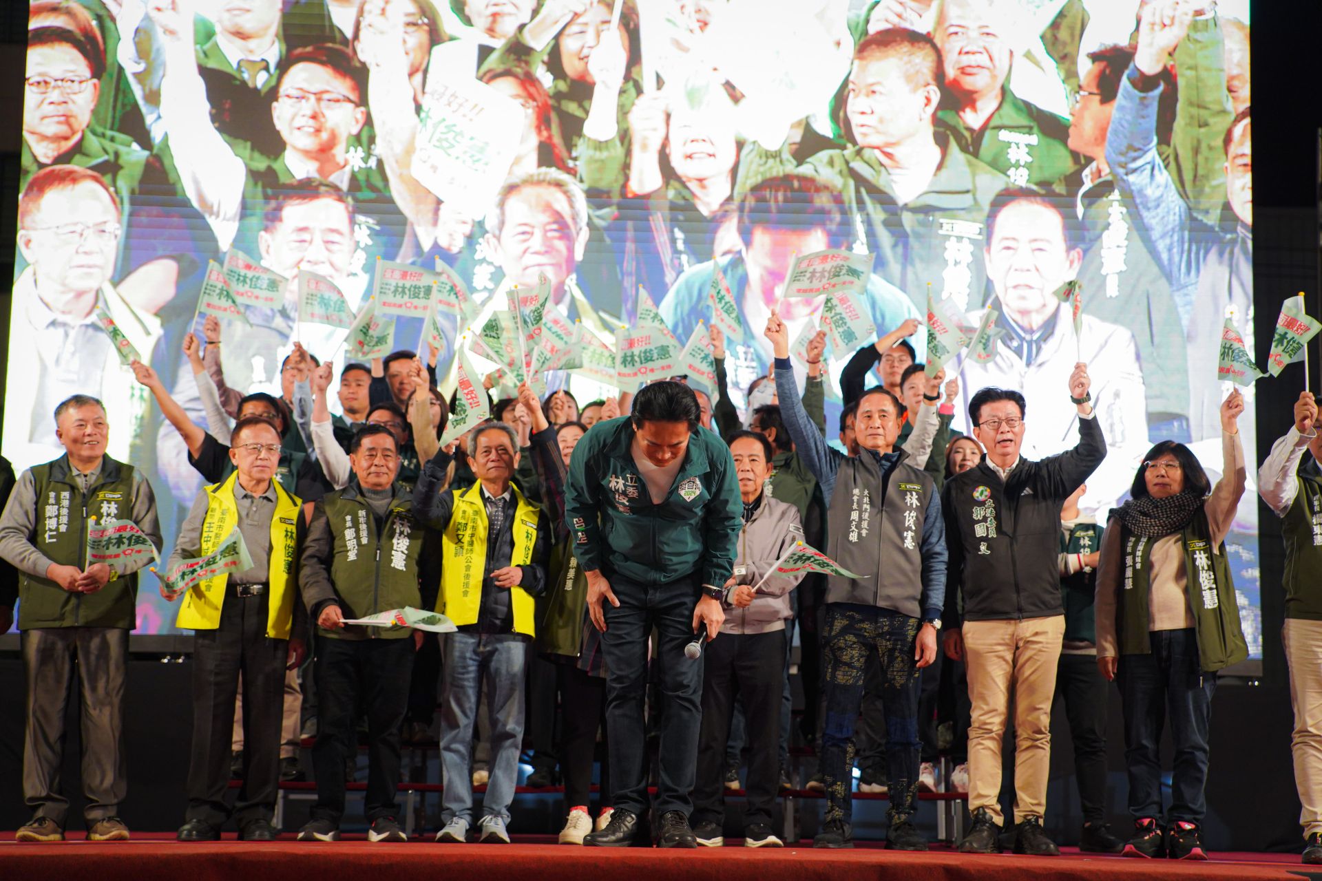 ▲台南市長參選人林俊憲向現場2萬多名支持者深深一鞠躬,表示一輩子的感謝相挺自己。(立委林俊憲團隊 提供)