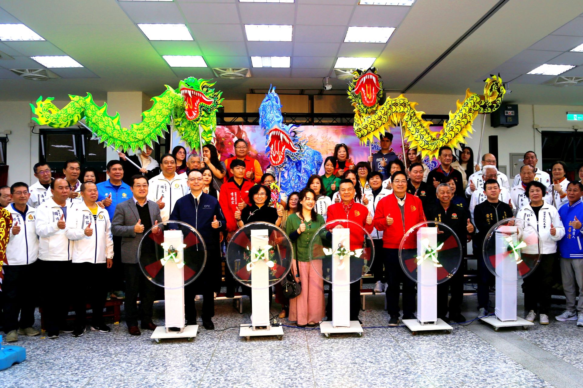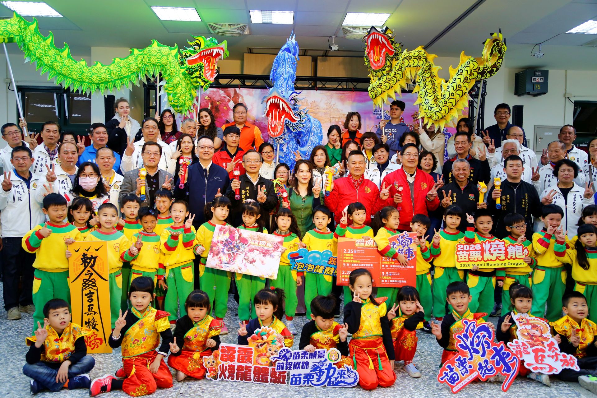 苗栗市公所今(3)日於嘉盛嘉新活動中心舉辦「2026苗栗火旁龍系列活動」宣傳記者會,苗栗市各社區祥龍齊聚,群龍聚首、氣勢磅礴,正式宣告年度火旁龍盛事啟動。