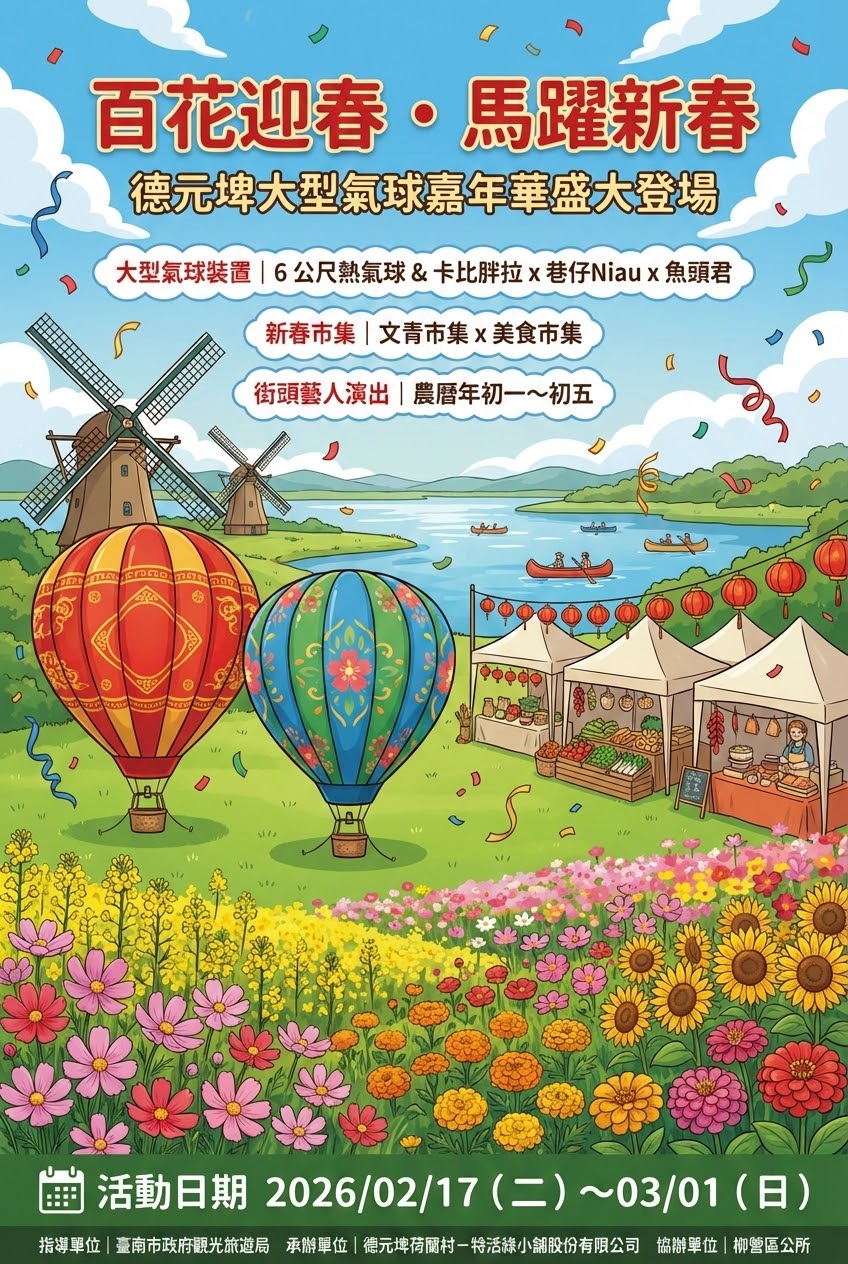 為迎接新春佳節,德元埤荷蘭村將於2月17日至3月1日舉辦「百花迎春・馬躍新春 德元埤大型氣球嘉年華」(2月15日至16日休園)。活動以大型氣球藝術裝置為主軸,結合人氣可愛角色、百花花海景緻及主題化露營體驗,打造春節期間兼具視覺亮點、親子互動與療癒氛圍的節慶型園區活動,邀請民眾走春踏青,感受德元埤獨有的新年魅力。