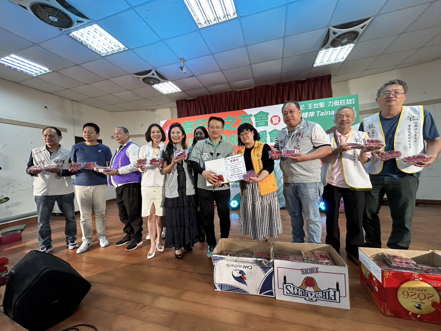 ▲青果西施-顏嘉縈結合了 山甲青果行「桔子潔潔」、四海青果行「水梨叔叔」及滿億行一同將幸福草莓贈與重症孩童、聖恩關懷協會及呂仙祖美業慈善協會關懷的孩子們共計300盒。(記者黃雋淮 攝)