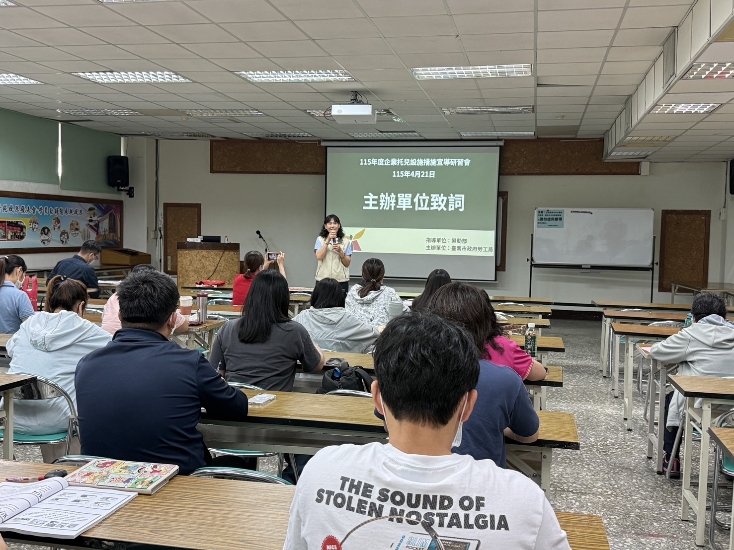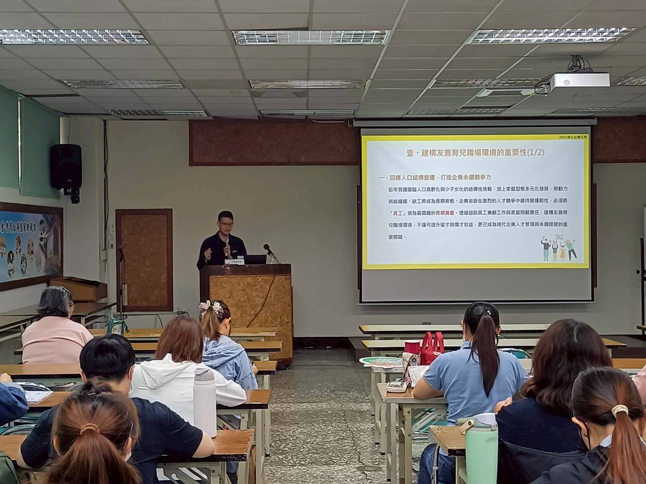 為落實市長黃偉哲「希望家園」施政願景,協助事業單位營造兼顧工作與家庭之友善職場環境,臺南市政府勞工局今(115)年規劃辦理5場次「企業托兒設施措施宣導研習會」。首場活動於今(4/21)日假南門勞工育樂中心辦理,期透過法規說明與實務經驗交流,推動事業單位積極辦理企業托兒。