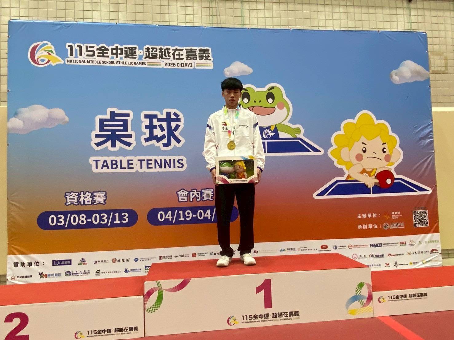▲忠孝國中余奕慶國男組桌球單打賽獲得金牌。(體育局 提供)