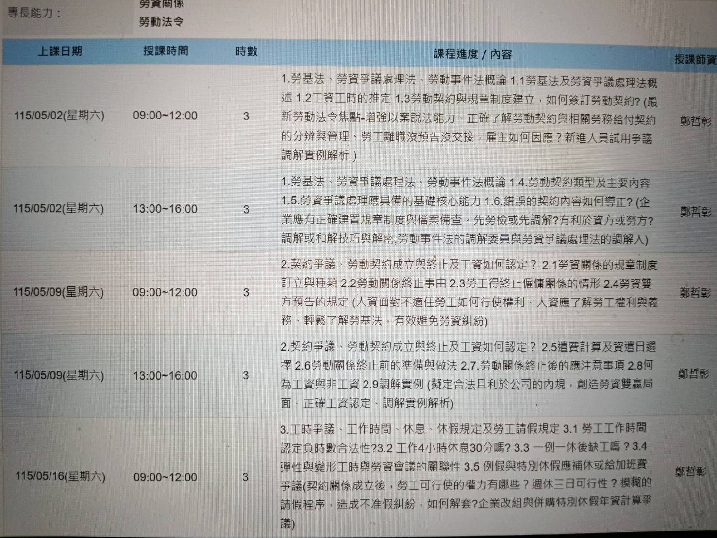 本次課程特別邀請鄭哲彰博士擔任講師,鄭博士現任司法院勞動事件調解委員、勞動部勞資爭議行政調解人,同時具備法學、人資及企業管理等跨領域專業背景,擁有豐富實務經驗,將帶領學員從案例中學習勞資關係應對之道。
