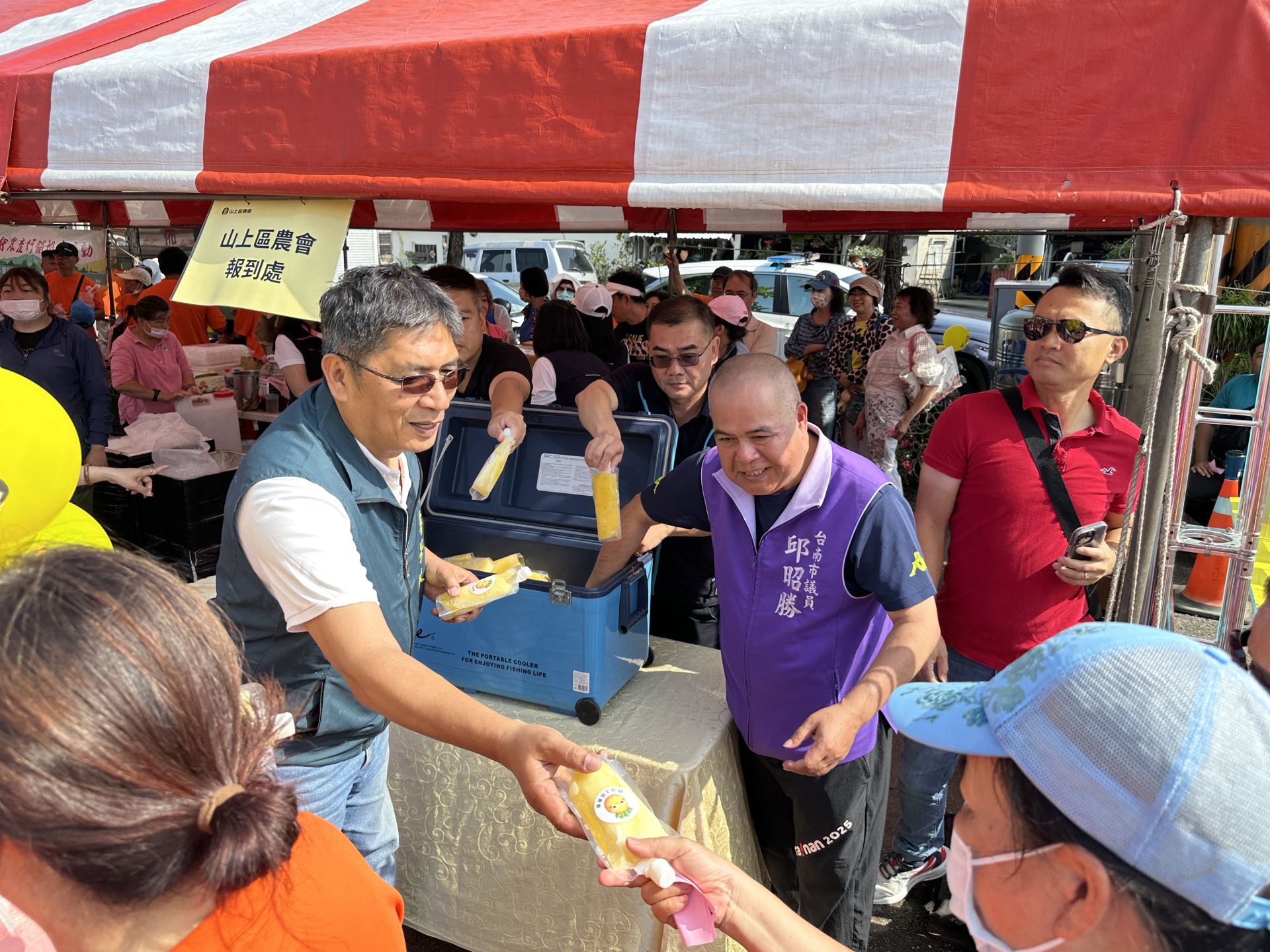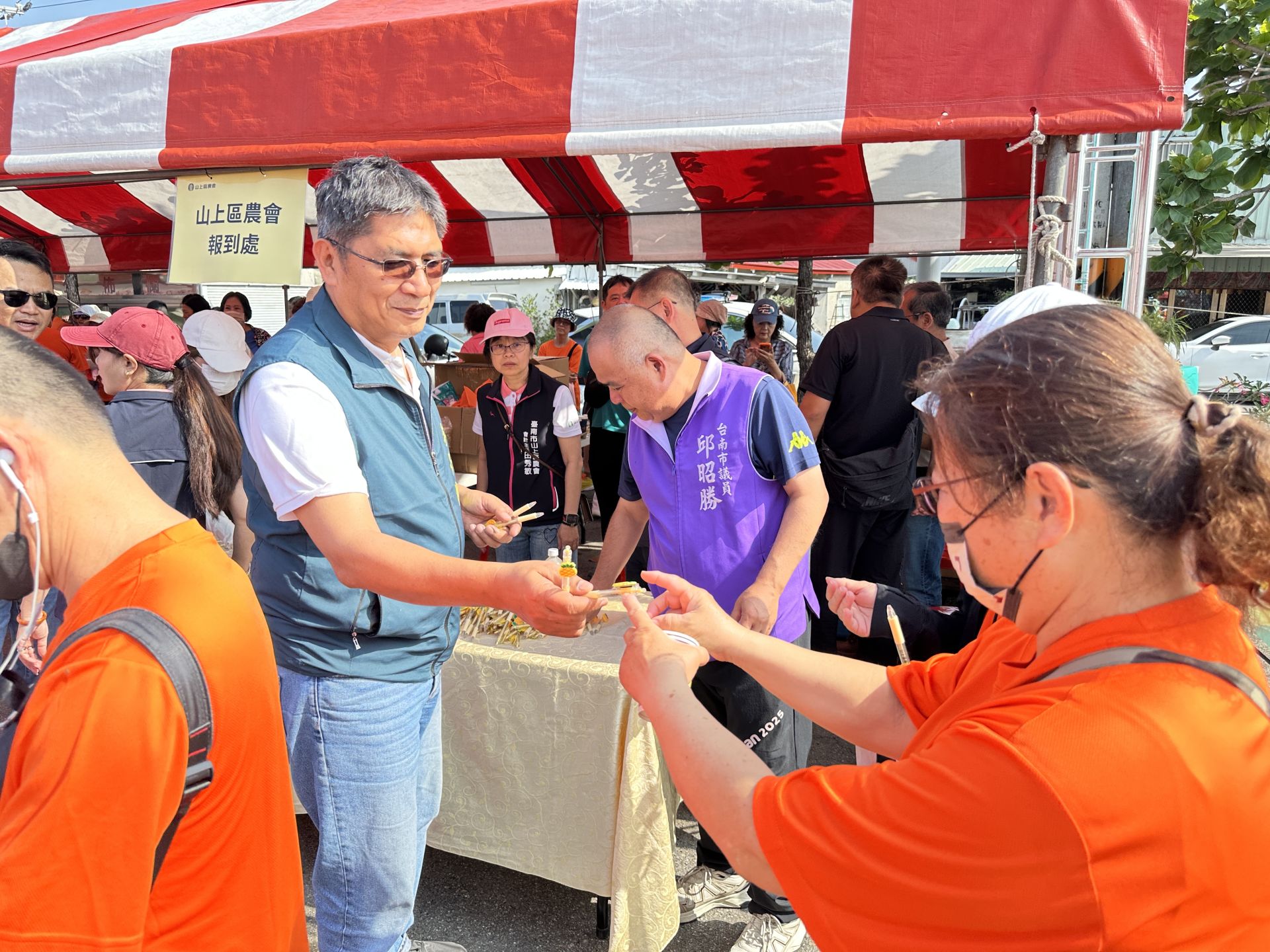 ▲農業局長李芳林幫忙拿試吃品給民眾吃。(山上區農會 提供)