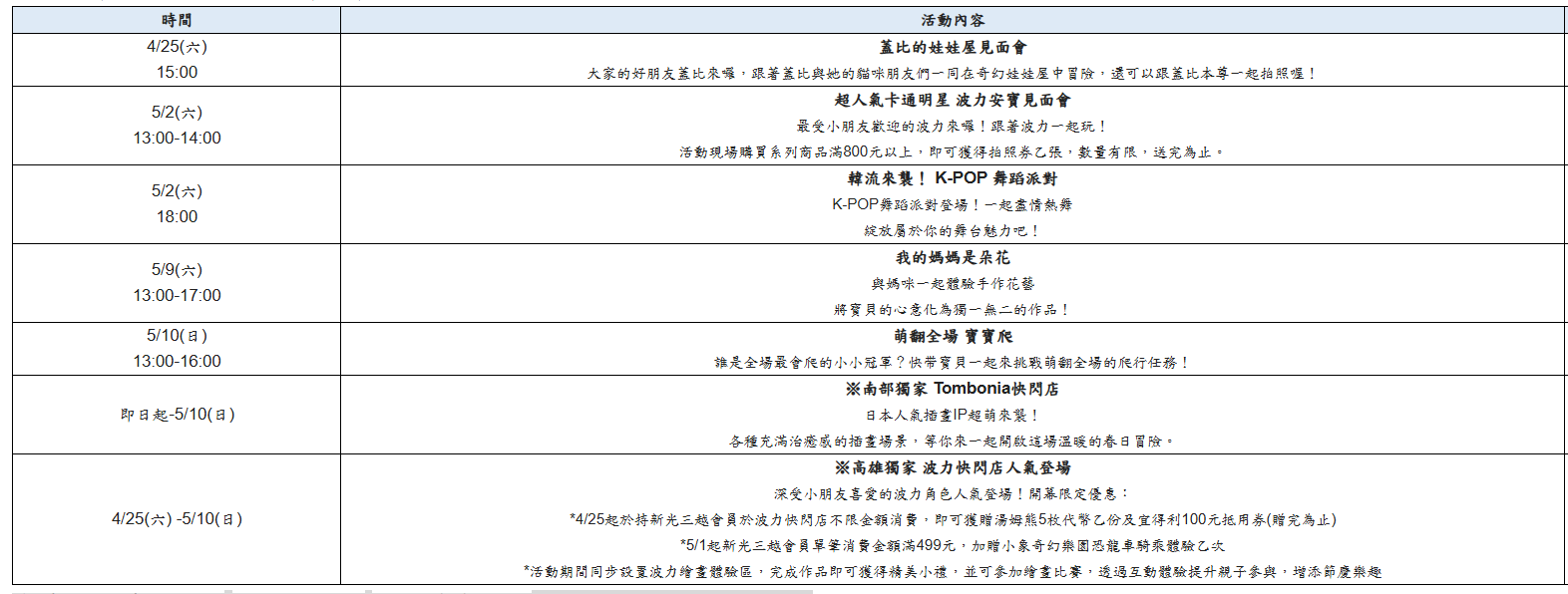 除了購物與體驗兼具,本檔期亦規劃多元話題活動,吸引不同族群參與。包含親子最愛的波力見面互動與波力主題快閃店,結合角色周邊、互動體驗與繪畫活動,打造專屬親子放電空間;同時還有熱血登場的K-POP舞蹈派對,以及南部獨家日本超人氣Tombonia快閃店,共同形塑母親節期間最具話題的聚客亮點。這個母親節,不只是送禮,更用時間陪伴,讓每一刻都成為最珍貴的回憶,寵愛媽咪,你我同行!