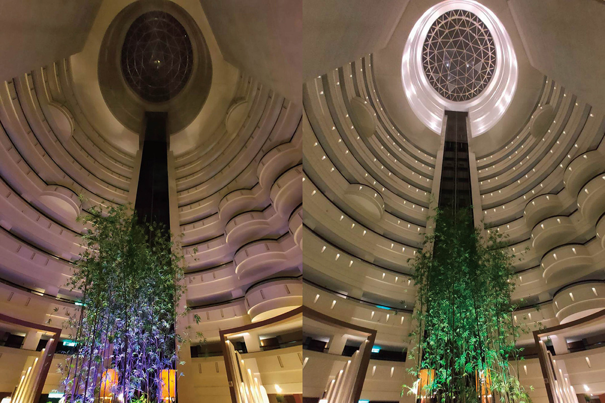▲台南遠東香格里拉飯店於Earth Hour期間調整中庭照明(圖左)與日常營運照明(圖右)對比。(圖/台南遠東香格里拉提供)