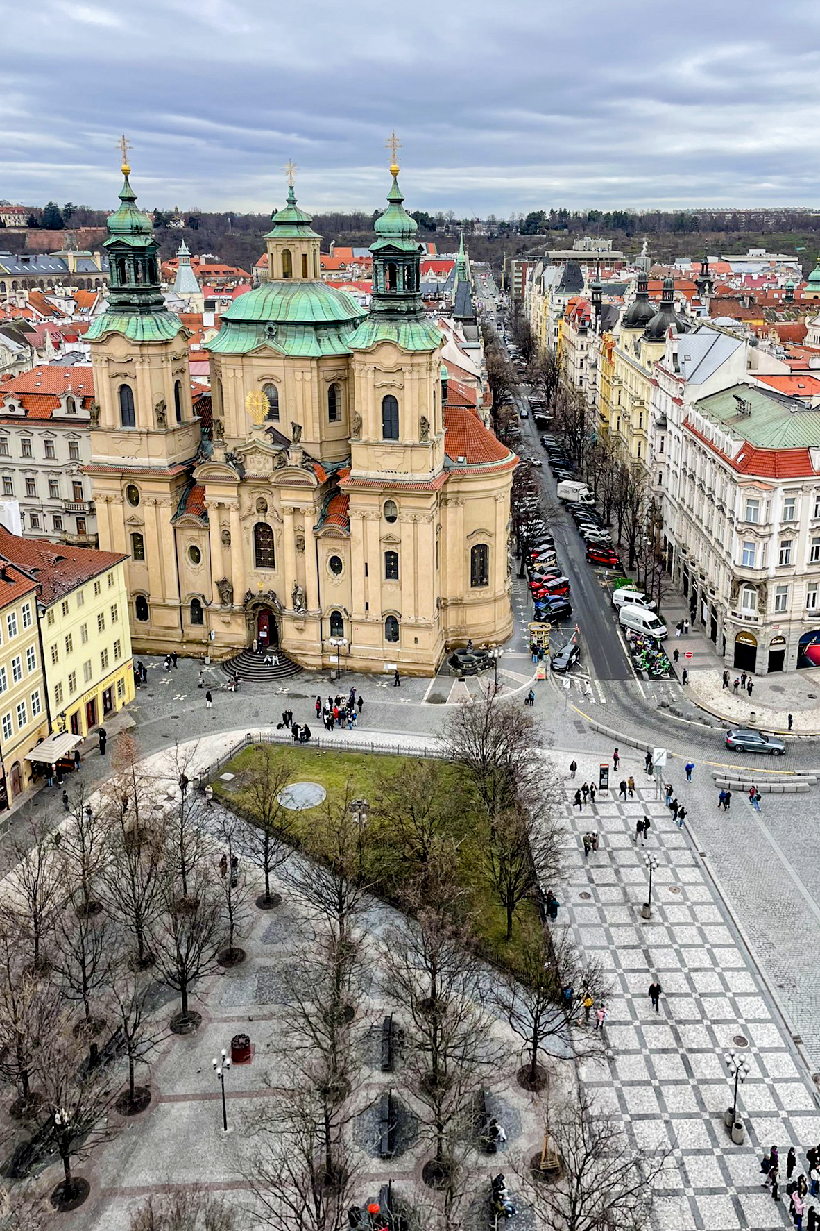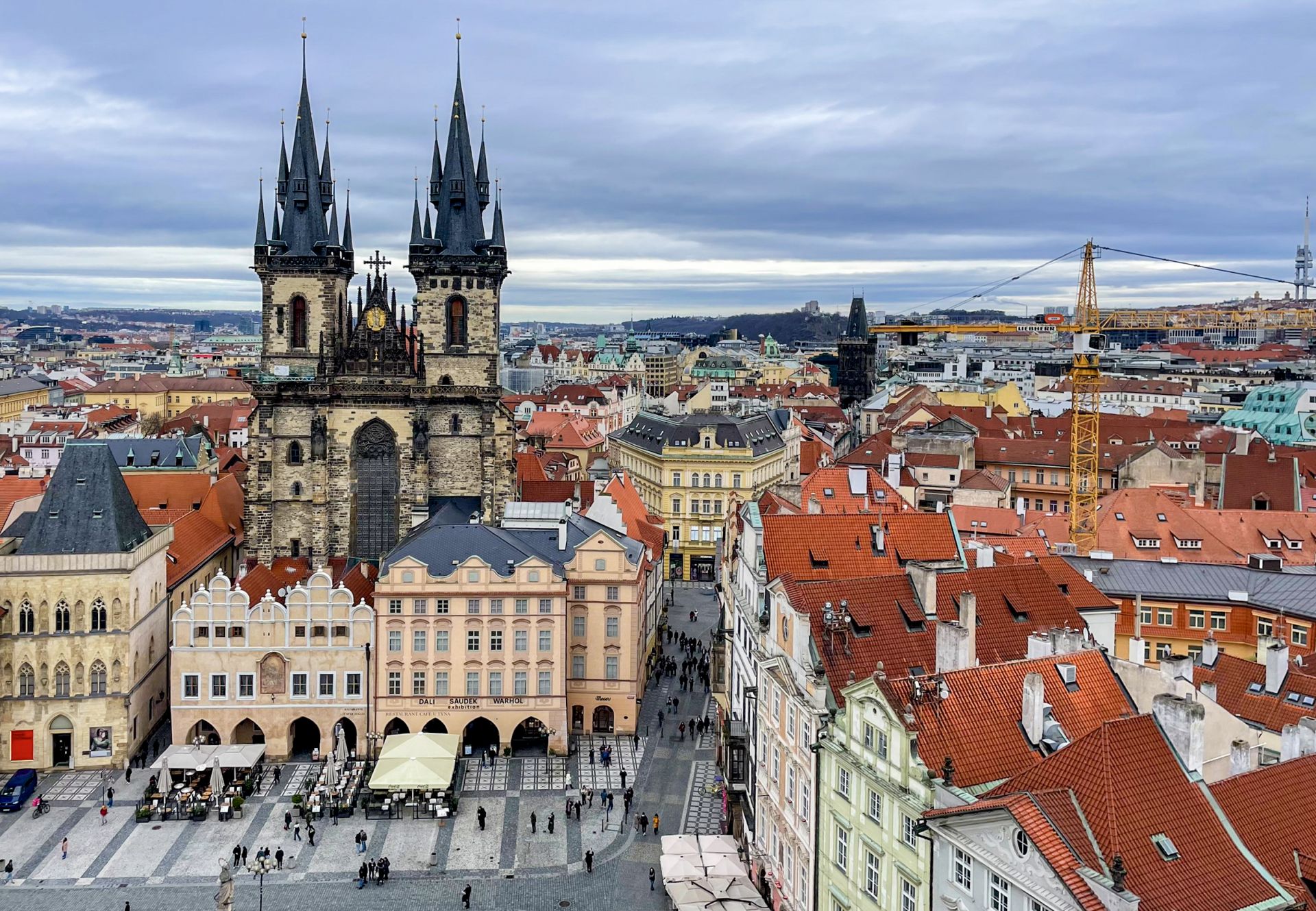 老市政廳塔樓對外開放登頂(設有電梯),遊客可自高處俯瞰整座舊城廣場。從塔樓遠望,提恩教堂的雙塔聳立天際,層層紅瓦屋頂綿延鋪展,構成布拉格最具代表性的城市天際線。(圖/記者葉秋蘭攝)