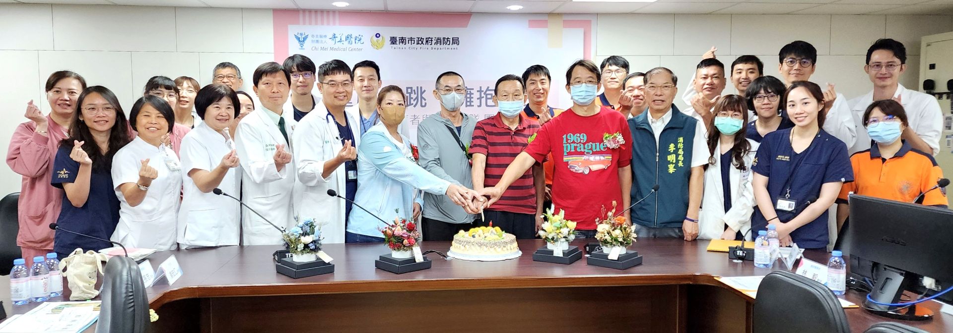 ▲4位康復病友重返奇美醫院,參加團聚分享會,與急救醫護團隊及消防人員一起切蛋糕慶祝重生,現場氣氛感人。(圖/奇美醫院提供)