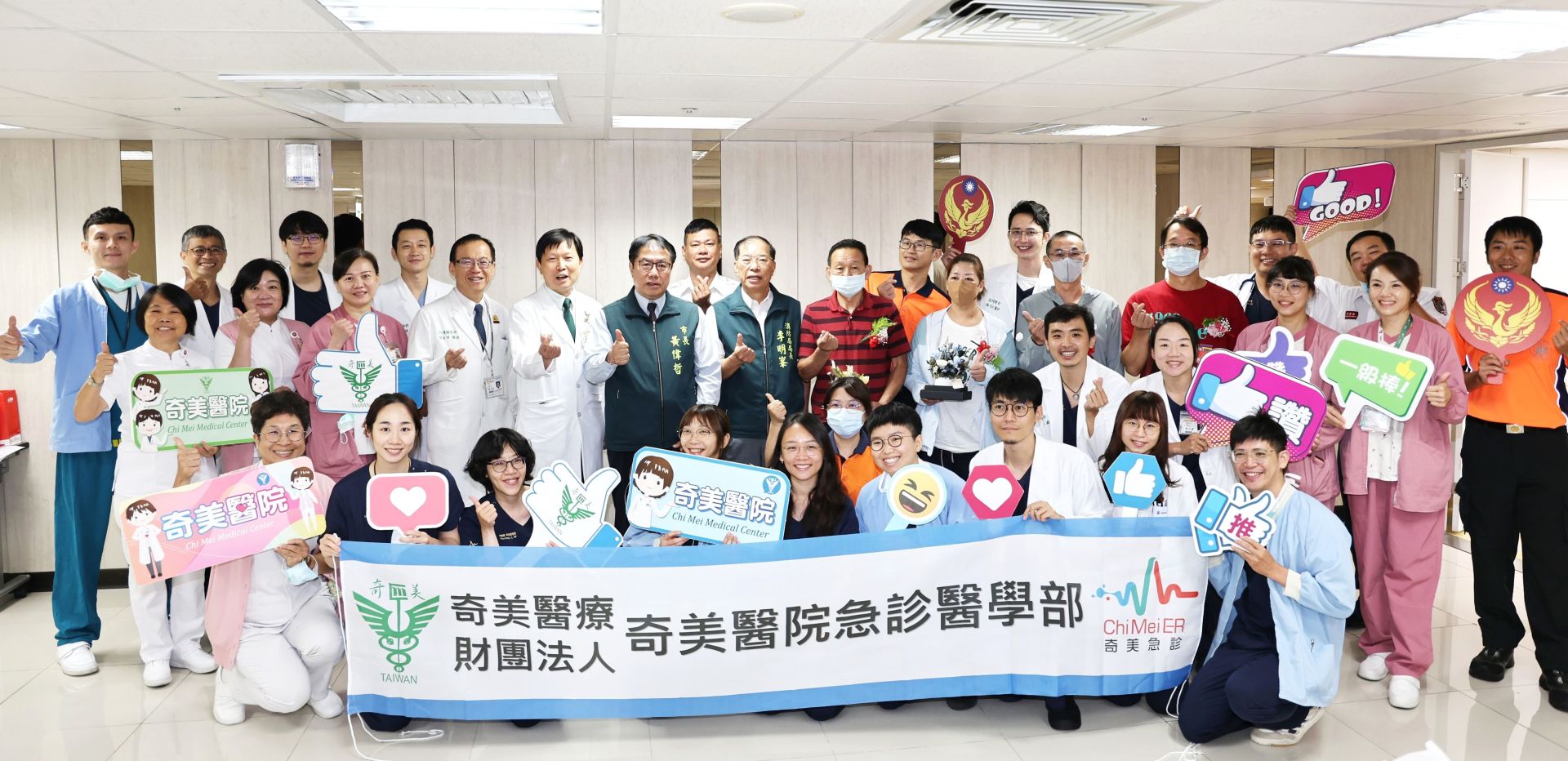 奇美醫院於10月13日舉辦「重啟心跳・擁抱新生」心跳停止康復者與急救團隊團聚分享會,活動邀請4位心跳停止(OHCA)成功康復的病友與家屬,與搶救的消防局緊急救護技術員、急診醫護、加護醫學部、心臟內科、心臟外科等跨科團隊再次相聚,共同分享生命重生的喜悅。