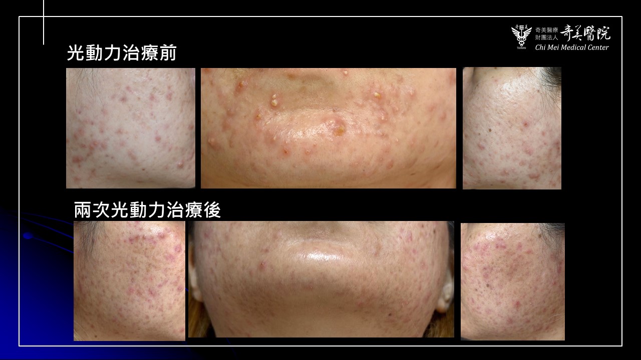 陳醫師診察後針對較嚴重的病灶進行痘痘針治療,並使用外用A酸及口服抗生素,但改善效果有限,準備使用口服A酸治療時,發現林小姐肝臟酵素異常,於是轉診至胃腸肝膽科治療。期間改安排2次光動力治療(Photodynamic Therapy)臉部痤瘡,情況有所改善,後續肝功能穩定,陳醫師評估後重新以口服A酸治療,療效顯著。』