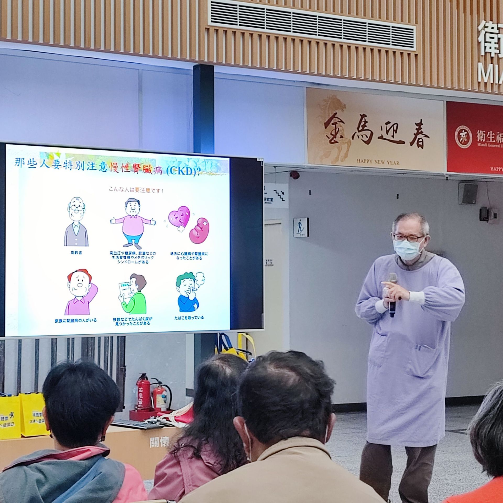 苗栗醫院「愛護腎臟」專題病友會,由腎臟科主任吳文中親自主講,吳主任特別提醒民眾,若發現尿液有經久不散的「泡」沫、下肢「水」腫、血壓「高」、「貧」血、臉色蒼白或經常體力不佳感「倦」,即是腎臟發出的求救訊號。請大家平時多留意「泡、水、高、貧、倦」五大徵兆自我檢測,掌握黃金治療期。