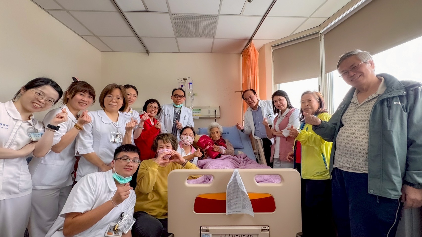 苗栗醫院醫療團隊與95歲曾姓阿嬤和家屬於病房合影,展現以病人為中心的跨團隊照護精神及醫病共享決策的尊重與關懷。(照片:苗栗醫院供)