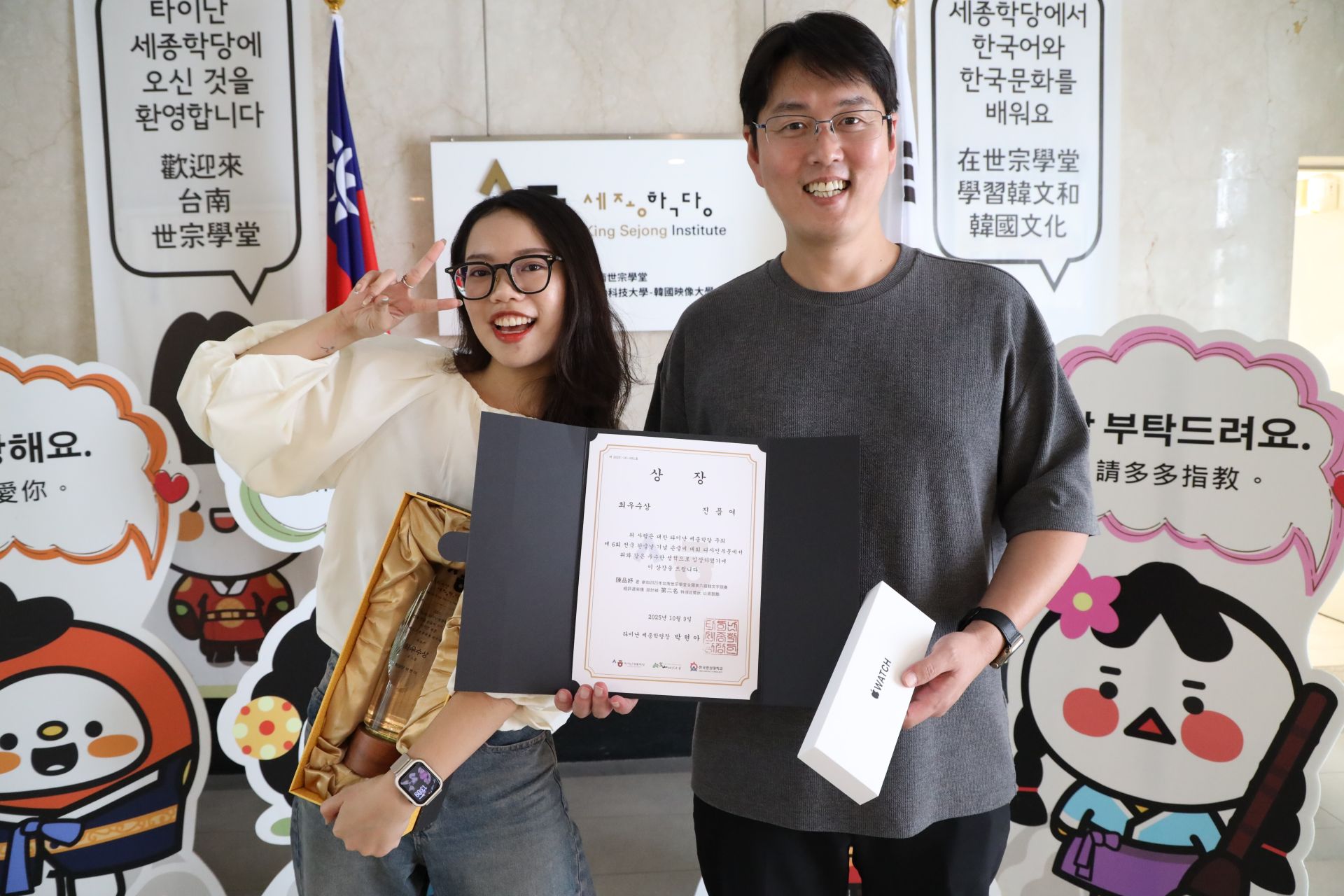 台南世宗學堂為崑山科技大學與韓國映像大學共同合作設立,是韓國政府官方唯一認證之教育機構,為慶祝韓國年度重要文化節日「韓文字節」,於今年持續舉辦「全國第六屆韓文字競賽」,10月9日公布得獎名單,除了頒發獎盃與獎狀,更頒發iPad、Apple Watch、Air Pods等精美獎品。