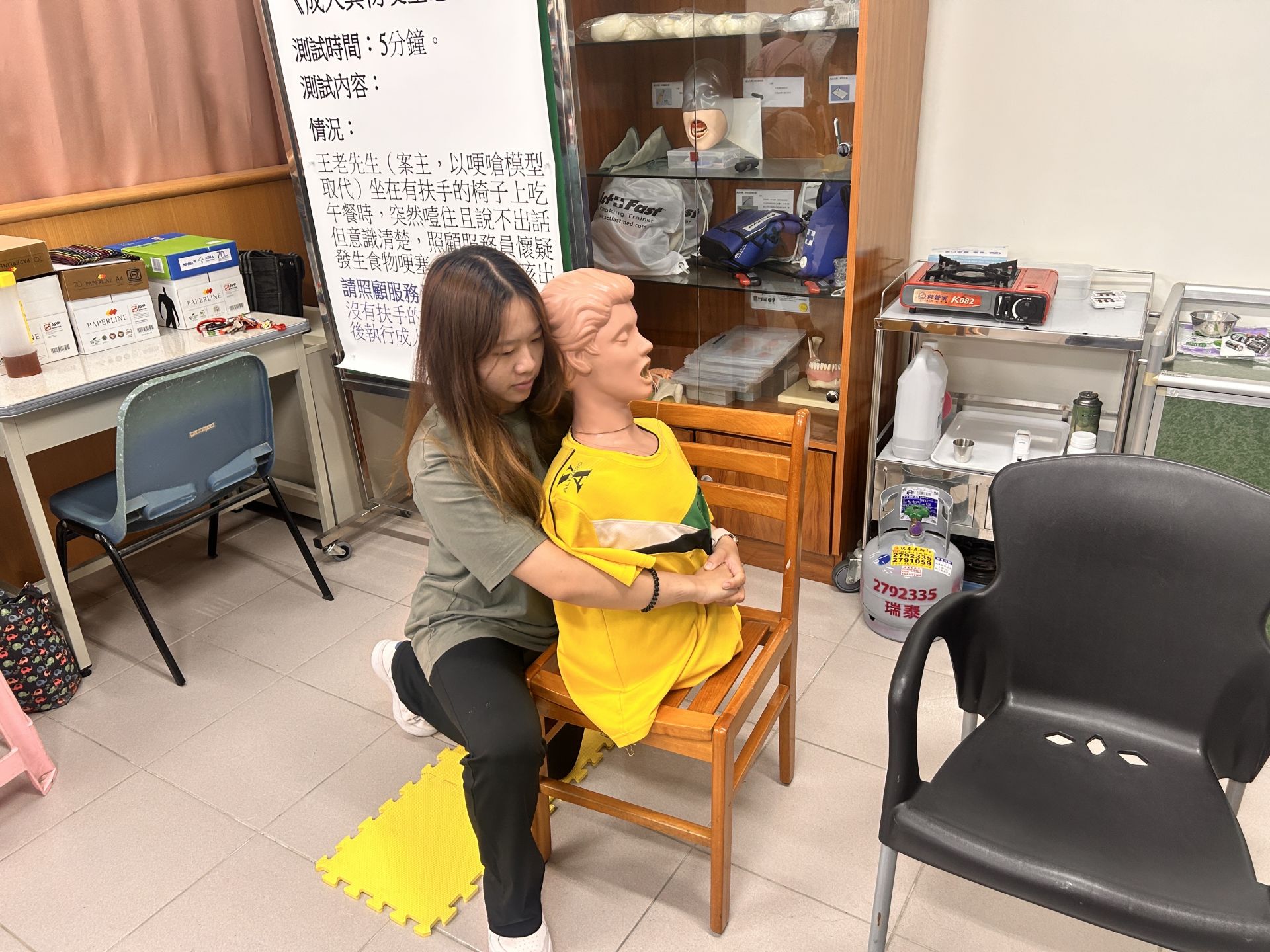 ▲林羽宣練習術科考試項目「哈姆立克法」。(圖/崑山科大提供)