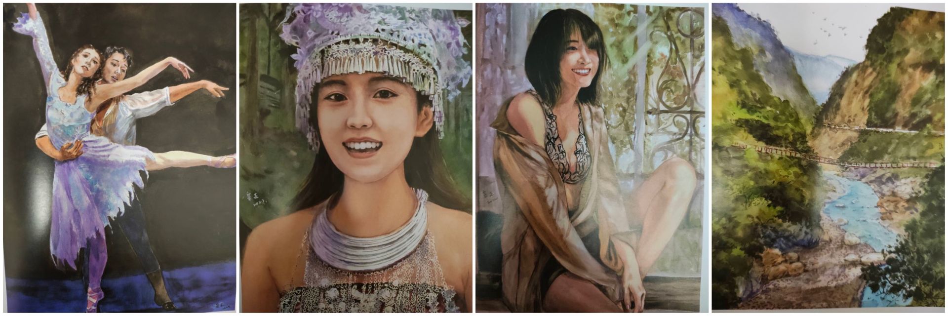 洪啓元指出,郭總裁畫山海林木,建築题材, 利用水與彩多次暈染、濁中透清暗中帶亮的氣韻生動。他的風景畫看似隨性順手拈來的揮灑,實則是對水和顏料行走軌跡的自由豪放安排,他的濕潤讓水與色交融,塑造了氛圍與意境。