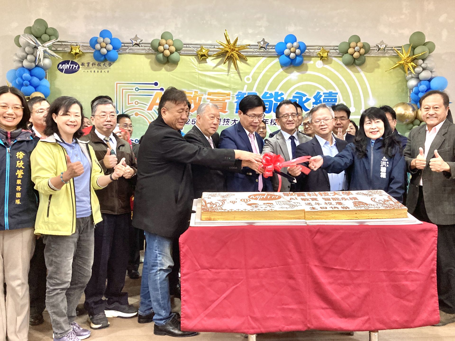 ▲敏實科大舉行五週年校慶典禮,曾信超校長(中)和與會貴賓們合影,並正式宣告敏實科大邁入「AI Agent 大學」新紀元!