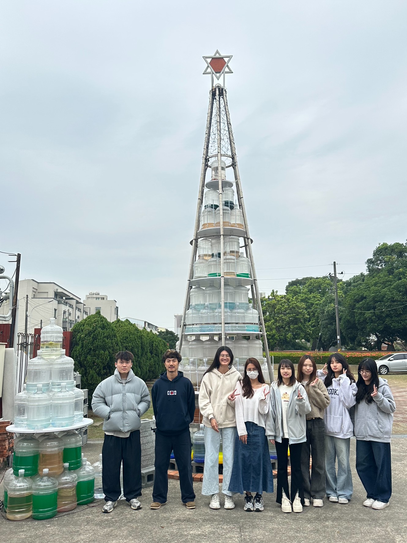 ▲空設系用水瓶打造《諾亞(方舟)之樹》永續聖誕樹,設計團隊合影。(圖/崑山科大提供)