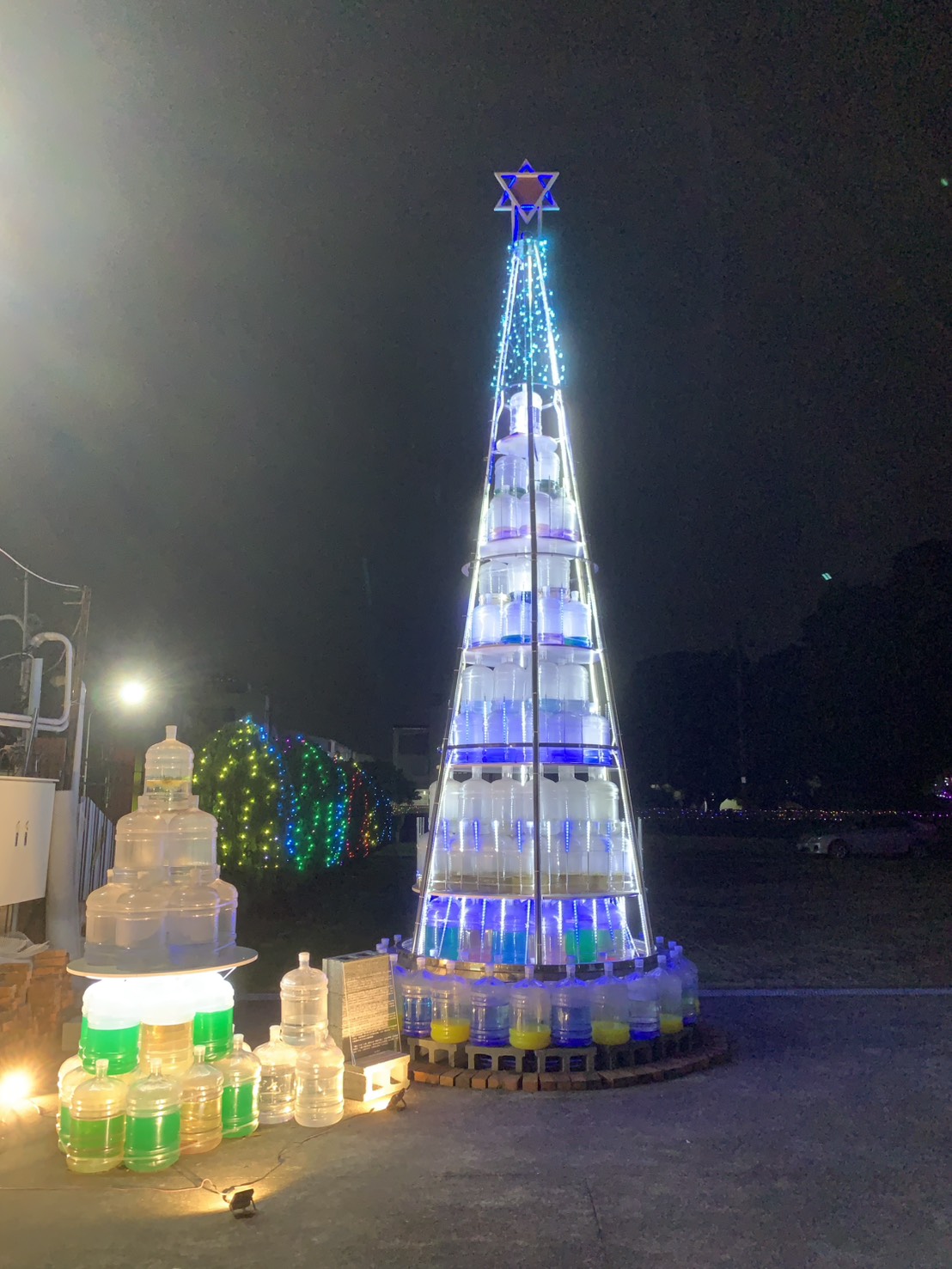 整體結構以透明飲用水瓶堆疊,瓶中灌注不同濃度的色水,呈現自下而上逐層變化的生命譜系,底層藍、綠、黃,象徵水、植物、陽光的起源;中層橙與紅代表動物與人類的生命溫度;頂層無色透明,象徵氣體、雲霧與呼吸,並指向生命最純粹的狀態。光線穿透瓶體時,色水與日光交錯反射,使整體呈現出如同呼吸般的光影律動,讓此聖誕樹不只是節慶裝置,更成為一座富含寓意的環境藝術。